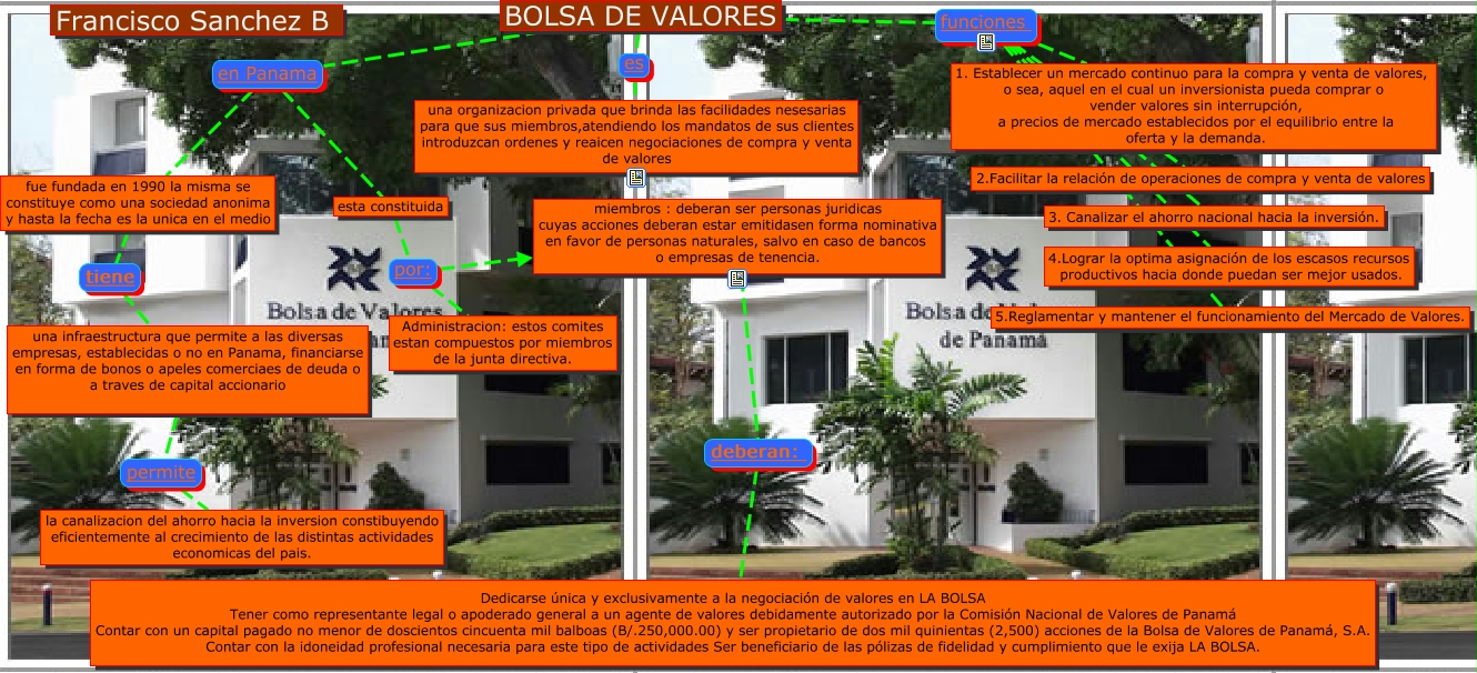 Este Cmap, tiene información relacionada con: bolsa de valores fs, miembros : deberan ser personas juridicas cuyas acciones deberan estar emitidasen forma nominativa en favor de personas naturales, salvo en caso de bancos o empresas de tenencia. deberan: Dedicarse única y exclusivamente a la negociación de valores en LA BOLSA Tener como representante legal o apoderado general a un agente de valores debidamente autorizado por la Comisión Nacional de Valores de Panamá Contar con un capital pagado no menor de doscientos cincuenta mil balboas (B/.250,000.00) y ser propietario de dos mil quinientas (2,500) acciones de la Bolsa de Valores de Panamá, S.A. Contar con la idoneidad profesional necesaria para este tipo de actividades Ser beneficiario de las pólizas de fidelidad y cumplimiento que le exija LA BOLSA., BOLSA DE VALORES funciones 5.Reglamentar y mantener el funcionamiento del Mercado de Valores., BOLSA DE VALORES es una organizacion privada que brinda las facilidades nesesarias para que sus miembros,atendiendo los mandatos de sus clientes introduzcan ordenes y reaicen negociaciones de compra y venta de valores, fue fundada en 1990 la misma se constituye como una sociedad anonima y hasta la fecha es la unica en el medio tiene una infraestructura que permite a las diversas empresas, establecidas o no en Panama, financiarse en forma de bonos o apeles comerciaes de deuda o a traves de capital accionario, BOLSA DE VALORES funciones 1. Establecer un mercado continuo para la compra y venta de valores, o sea, aquel en el cual un inversionista pueda comprar o vender valores sin interrupción, a precios de mercado establecidos por el equilibrio entre la oferta y la demanda., BOLSA DE VALORES funciones 3. Canalizar el ahorro nacional hacia la inversión., BOLSA DE VALORES en Panama fue fundada en 1990 la misma se constituye como una sociedad anonima y hasta la fecha es la unica en el medio, una infraestructura que permite a las diversas empresas, establecidas o no en Panama, financiarse en forma de bonos o apeles comerciaes de deuda o a traves de capital accionario permite la canalizacion del ahorro hacia la inversion constibuyendo eficientemente al crecimiento de las distintas actividades economicas del pais., BOLSA DE VALORES funciones 4.Lograr la optima asignación de los escasos recursos productivos hacia donde puedan ser mejor usados., esta constituida por: miembros : deberan ser personas juridicas cuyas acciones deberan estar emitidasen forma nominativa en favor de personas naturales, salvo en caso de bancos o empresas de tenencia., BOLSA DE VALORES funciones 2.Facilitar la relación de operaciones de compra y venta de valores, esta constituida por: Administracion: estos comites estan compuestos por miembros de la junta directiva., BOLSA DE VALORES en Panama esta constituida