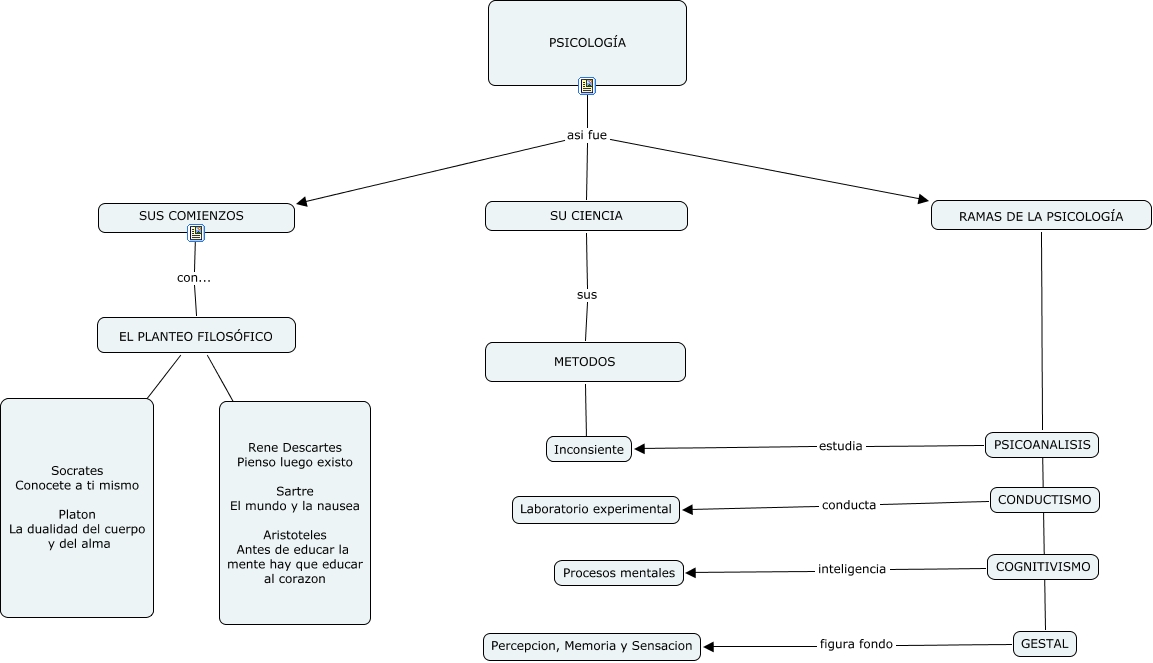 Este Cmap, tiene información relacionada con: Psicologia, PSICOLOGÍA asi fue RAMAS DE LA PSICOLOGÍA, SUS COMIENZOS con... EL PLANTEO FILOSÓFICO, RAMAS DE LA PSICOLOGÍA ???? GESTAL, CONDUCTISMO conducta Laboratorio experimental, COGNITIVISMO inteligencia ????, PSICOLOGÍA asi fue SU CIENCIA, EL PLANTEO FILOSÓFICO ???? Socrates Conocete a ti mismo Platon La dualidad del cuerpo y del alma, EL PLANTEO FILOSÓFICO ???? Rene Descartes Pienso luego existo Sartre El mundo y la nausea Aristoteles Antes de educar la mente hay que educar al corazon, METODOS ???? Inconsiente, GESTAL figura fondo Percepcion, Memoria y Sensacion, SU CIENCIA sus METODOS, PSICOLOGÍA asi fue SUS COMIENZOS, PSICOANALISIS estudia Inconsiente