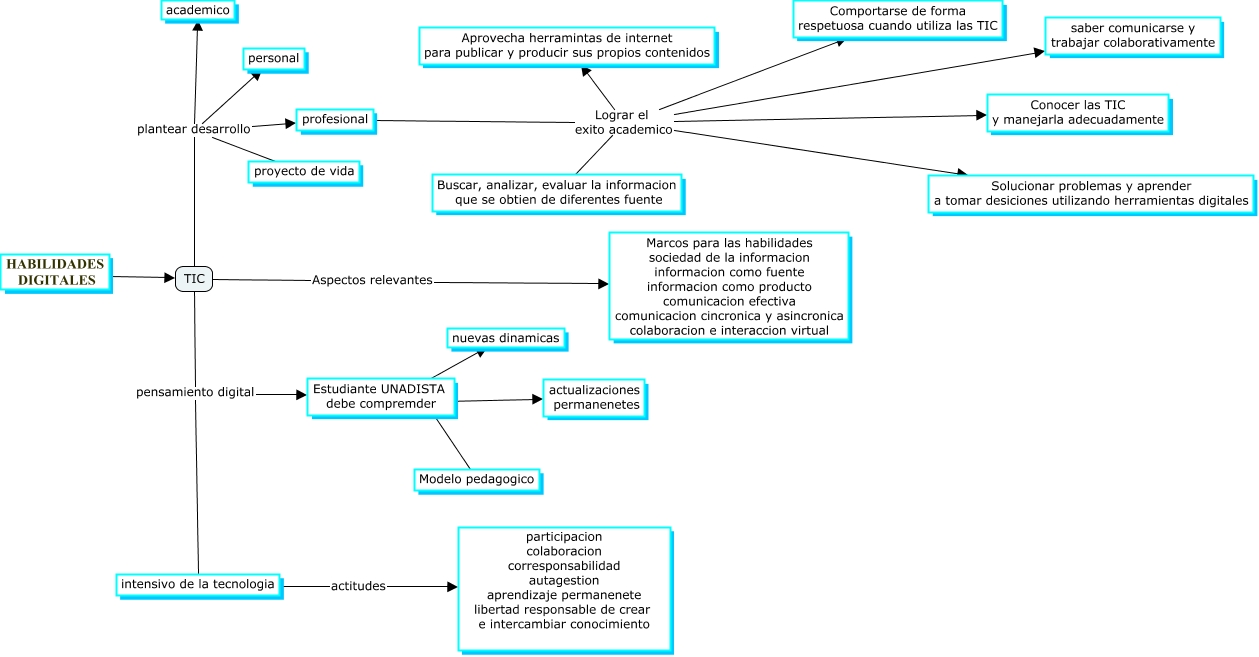 Este Cmap, tiene información relacionada con: HABILIDADES DIGITALES, TIC plantear desarrollo academico, TIC plantear desarrollo personal, profesional Lograr el exito academico Conocer las TIC y manejarla adecuadamente, TIC plantear desarrollo profesional, TIC pensamiento digital Estudiante UNADISTA debe compremder, TIC pensamiento digital intensivo de la tecnologia, profesional Lograr el exito academico Buscar, analizar, evaluar la informacion que se obtien de diferentes fuente, TIC Aspectos relevantes Marcos para las habilidades sociedad de la informacion informacion como fuente informacion como producto comunicacion efectiva comunicacion cincronica y asincronica colaboracion e interaccion virtual, profesional Lograr el exito academico Aprovecha herramintas de internet para publicar y producir sus propios contenidos, Estudiante UNADISTA debe compremder ???? actualizaciones permanenetes, profesional Lograr el exito academico Solucionar problemas y aprender a tomar desiciones utilizando herramientas digitales, profesional Lograr el exito academico saber comunicarse y trabajar colaborativamente, TIC plantear desarrollo proyecto de vida, Estudiante UNADISTA debe compremder ???? Modelo pedagogico, Estudiante UNADISTA debe compremder ???? nuevas dinamicas, intensivo de la tecnologia actitudes participacion colaboracion corresponsabilidad autagestion aprendizaje permanenete libertad responsable de crear e intercambiar conocimiento, profesional Lograr el exito academico Comportarse de forma respetuosa cuando utiliza las TIC, HABILIDADES DIGITALES ???? TIC