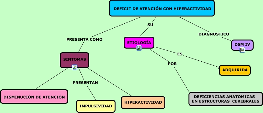 Este Cmap, tiene información relacionada con: CMap TDAH, DEFICIT DE ATENCIÓN CON HIPERACTIVIDAD PRESENTA COMO SINTOMAS, DEFICIT DE ATENCIÓN CON HIPERACTIVIDAD DIAGNOSTICO DSM IV, ETIOLOGÍA POR DEFICIENCIAS ANATOMICAS EN ESTRUCTURAS CEREBRALES, SINTOMAS 1 DISMINUCIÓN DE ATENCIÓN, DEFICIT DE ATENCIÓN CON HIPERACTIVIDAD SU ETIOLOGÍA, SINTOMAS PRESENTAN IMPULSIVIDAD, ETIOLOGÍA ES ????, SINTOMAS ???? ????