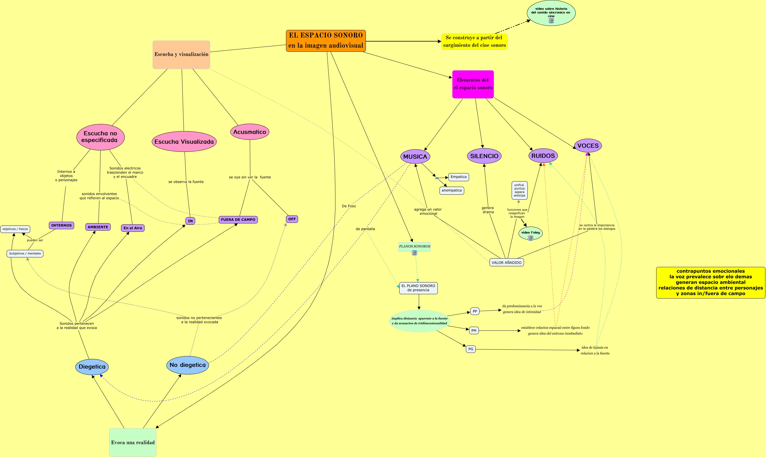 Este Cmap, tiene información relacionada con: Espacio sonoro audiovisual, VALOR AÑADIDO genera drama SILENCIO, EL PLANO SONORO de presencia implica distancia aparente a la fuente y da sensacion de tridimensionalidad PG, Diegetica Sonidos pertenecen a la realidad que evoca FUERA DE CAMPO, INTERNOS pueden ser objetivos / fisicos, Escucha no especificada Sonidos electricos trascienden el marco y el encuadre En el Aire, PG idea de lejanía en relacion a la fuente RUIDOS, MUSICA es Empatica, FUERA DE CAMPO Sonidos electricos trascienden el marco y el encuadre En el Aire, EL PLANO SONORO de presencia implica distancia aparente a la fuente y da sensacion de tridimensionalidad PP, Diegetica Sonidos pertenecen a la realidad que evoca AMBIENTE, EL ESPACIO SONORO en la imagen audiovisual Elementos del el espacio sonoro MUSICA, EL ESPACIO SONORO en la imagen audiovisual PLANOS SONOROS EL PLANO SONORO de presencia, EL ESPACIO SONORO en la imagen audiovisual Elementos del el espacio sonoro SILENCIO, EL ESPACIO SONORO en la imagen audiovisual Evoca una realidad No diegetica, MUSICA es anempatica, PG idea de lejanía en relacion a la fuente VOCES, VALOR AÑADIDO se centra la importancia en la palabra los dialogos VOCES, VALOR AÑADIDO Escucha y visualización Escucha Visualizada, MUSICA de pantalla EL PLANO SONORO de presencia, EL ESPACIO SONORO en la imagen audiovisual Elementos del el espacio sonoro RUIDOS