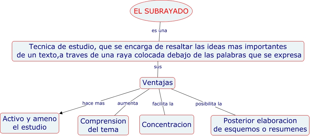 Este Cmap, tiene información relacionada con: EL SUBRAYADO, Ventajas hace mas Activo y ameno el estudio, Tecnica de estudio, que se encarga de resaltar las ideas mas importantes de un texto,a traves de una raya colocada debajo de las palabras que se expresa sus Ventajas, Ventajas posibilita la Posterior elaboracion de esquemos o resumenes, Ventajas facilita la Concentracion, Ventajas aumenta Comprension del tema, EL SUBRAYADO es una Tecnica de estudio, que se encarga de resaltar las ideas mas importantes de un texto,a traves de una raya colocada debajo de las palabras que se expresa