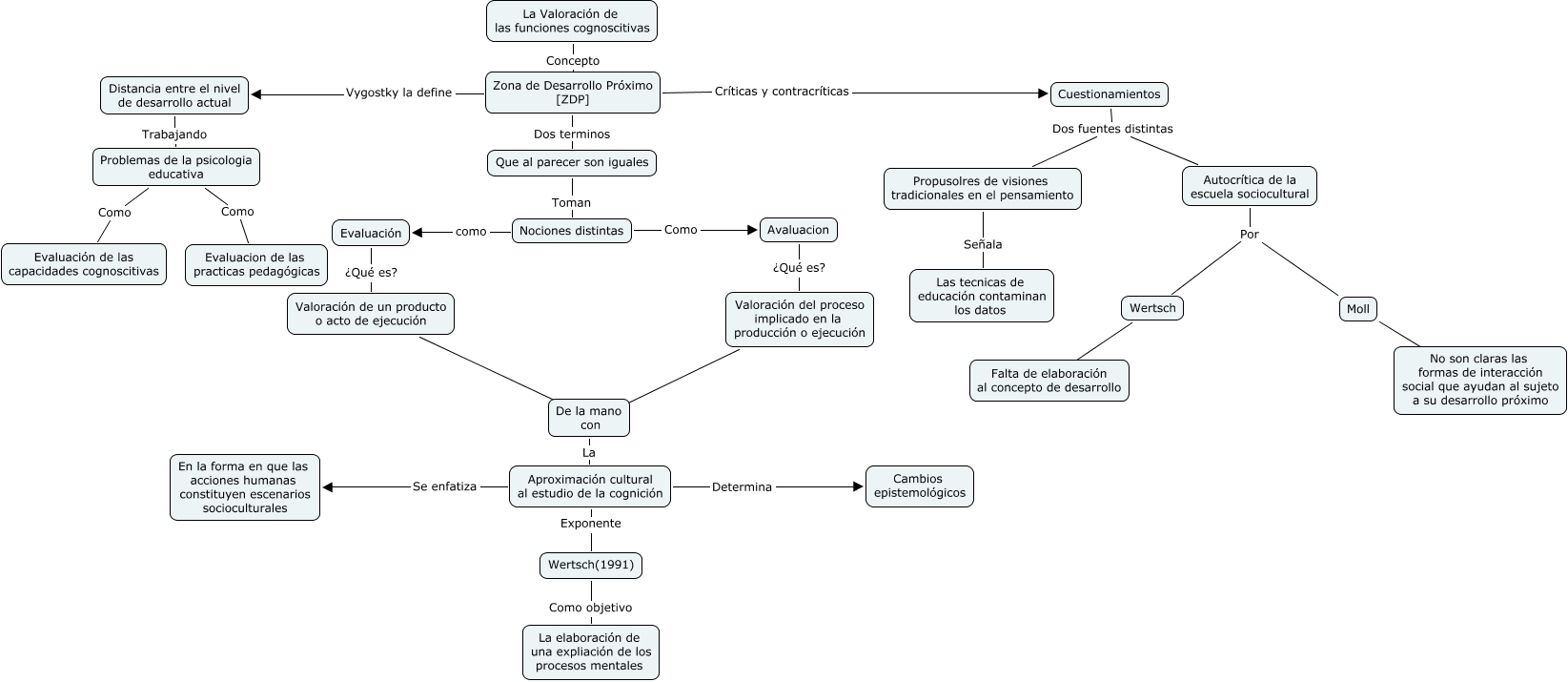Este Cmap, tiene información relacionada con: Articulo, Cuestionamientos Dos fuentes distintas Autocrítica de la escuela sociocultural, Valoración de un producto o acto de ejecución ???? De la mano con, Propusolres de visiones tradicionales en el pensamiento Señala Las tecnicas de educación contaminan los datos, Evaluación ¿Qué es? Valoración de un producto o acto de ejecución, De la mano con La Aproximación cultural al estudio de la cognición, Zona de Desarrollo Próximo [ZDP] Dos terminos Que al parecer son iguales, Que al parecer son iguales Toman Nociones distintas, Autocrítica de la escuela sociocultural Por Wertsch, Valoración del proceso implicado en la producción o ejecución ???? De la mano con, Aproximación cultural al estudio de la cognición Se enfatiza En la forma en que las acciones humanas constituyen escenarios socioculturales, Wertsch(1991) Como objetivo La elaboración de una expliación de los procesos mentales, La Valoración de las funciones cognoscitivas Concepto Zona de Desarrollo Próximo [ZDP], Nociones distintas como Evaluación, Cuestionamientos Dos fuentes distintas Propusolres de visiones tradicionales en el pensamiento, Wertsch ???? Falta de elaboración al concepto de desarrollo, Aproximación cultural al estudio de la cognición Determina Cambios epistemológicos, Moll ???? No son claras las formas de interacción social que ayudan al sujeto a su desarrollo próximo, Zona de Desarrollo Próximo [ZDP] Críticas y contracríticas Cuestionamientos, Aproximación cultural al estudio de la cognición Exponente Wertsch(1991), Nociones distintas Como Avaluacion