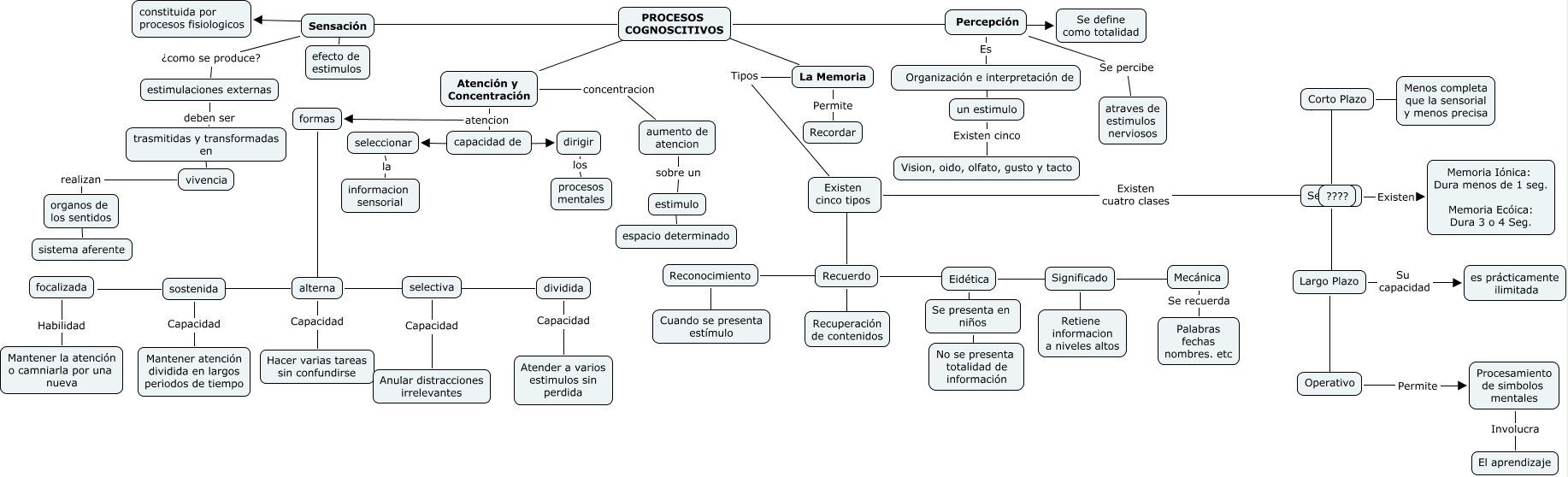 Este Cmap, tiene información relacionada con: Procesos Cognoscitivos, Largo Plazo ???? Operativo, Recuerdo ???? Recuperación de contenidos, alterna Capacidad Hacer varias tareas sin confundirse, focalizada Habilidad Mantener la atención o camniarla por una nueva, Reconocimiento ???? Recuerdo, Se presenta en niños ???? No se presenta totalidad de información, Significado ???? Mecánica, estimulo ???? espacio determinado, formas ???? alterna, Existen cinco tipos ???? Recuerdo, selectiva Capacidad Anular distracciones irrelevantes, estimulaciones externas deben ser trasmitidas y transformadas en, capacidad de ???? seleccionar, Operativo Permite Procesamiento de simbolos mentales, Atención y Concentración atencion capacidad de, PROCESOS COGNOSCITIVOS La Percepción, Sensorial ???? Largo Plazo, un estimulo Existen cinco Vision, oido, olfato, gusto y tacto, La Memoria Tipos Existen cinco tipos, Atención y Concentración atencion formas