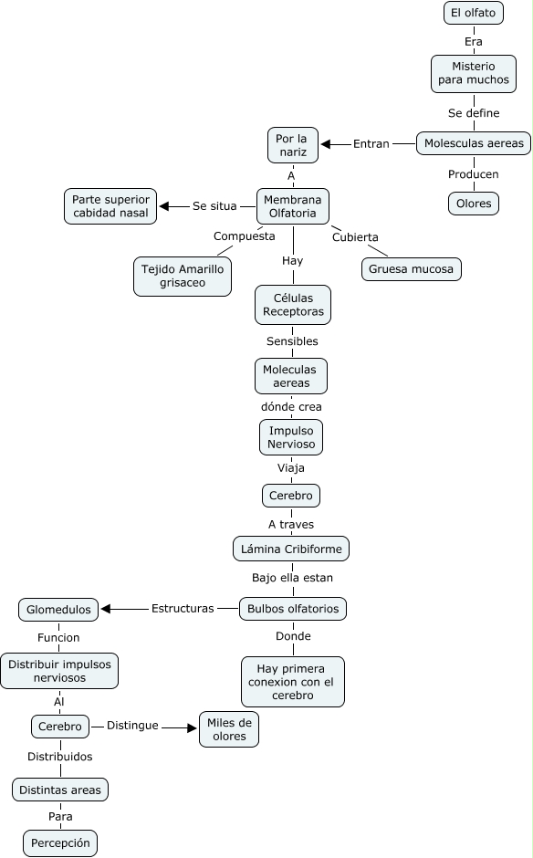 Este Cmap, tiene información relacionada con: Video El olfato, Lámina Cribiforme Bajo ella estan Bulbos olfatorios, Impulso Nervioso Viaja Cerebro, Cerebro A traves Lámina Cribiforme, Molesculas aereas Producen Olores, Bulbos olfatorios Estructuras Glomedulos, Por la nariz A Membrana Olfatoria, El olfato Era Misterio para muchos, Distintas areas Para Percepción, Cerebro Distingue Miles de olores, Membrana Olfatoria Se situa Parte superior cabidad nasal, Células Receptoras Sensibles Moleculas aereas, Bulbos olfatorios Donde Hay primera conexion con el cerebro, Glomedulos Funcion Distribuir impulsos nerviosos, Membrana Olfatoria Cubierta Gruesa mucosa, Cerebro Distribuidos Distintas areas, Distribuir impulsos nerviosos Al Cerebro, Membrana Olfatoria Hay Células Receptoras, Misterio para muchos Se define Molesculas aereas, Molesculas aereas Entran Por la nariz, Moleculas aereas dónde crea Impulso Nervioso