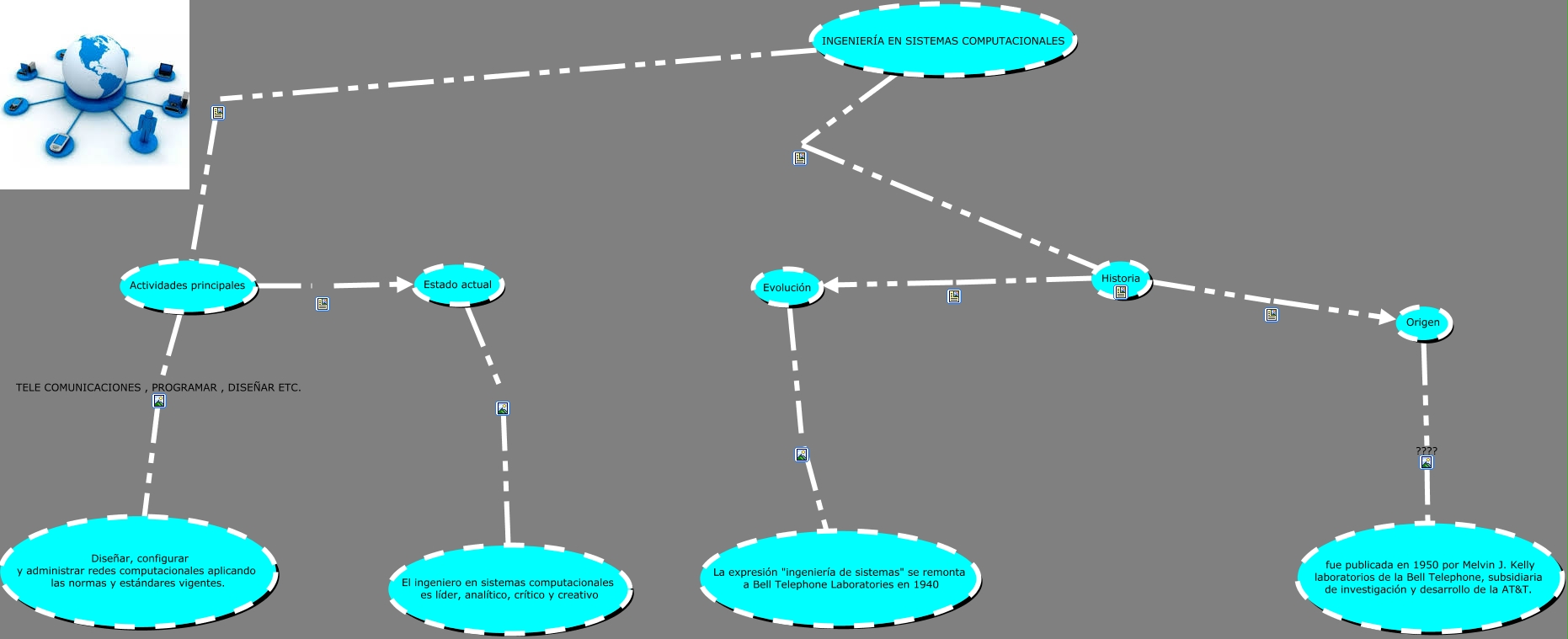 Este Cmap, tiene información relacionada con: kikehiustoria de isc, Estado actual El ingeniero en sistemas computacionales es líder, analítico, crítico y creativo, Historia Origen, Origen ???? fue publicada en 1950 por Melvin J. Kelly laboratorios de la Bell Telephone, subsidiaria de investigación y desarrollo de la AT&T., Actividades principales Estado actual, Historia Evolución, INGENIERÍA EN SISTEMAS COMPUTACIONALES Historia, INGENIERÍA EN SISTEMAS COMPUTACIONALES Actividades principales, Evolución La expresión "ingeniería de sistemas" se remonta a Bell Telephone Laboratories en 1940, Actividades principales TELE COMUNICACIONES , PROGRAMAR , DISEÑAR ETC. Diseñar, configurar y administrar redes computacionales aplicando las normas y estándares vigentes.