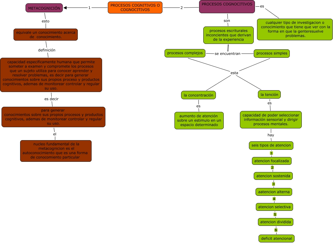 Este Cmap, tiene información relacionada con: PROCESOS COGNITIVOS O COGNOCITIVOS, aatencion alterna 4 atencion selectiva, equivale un conocimiento acerca de conocimiento. esto METACOGNICIÓN, capacidad especificamente humana que permite someter a examen y compromete los procesos que un sujeto utiliza para conocer aprender y resolver problemas, es decir para generar conocimientos sobre sus propios proceso y productos cognitivos, ademas de monitorear controlar y regular su uso. definición equivale un conocimiento acerca de conocimiento., PROCESOS COGNITIVOS O COGNOCITIVOS 2 PROCESOS COGNOCITIVOS, la concentración esta procesos complejos, seis tipos de atencion 1 atencion focalizada, para generar conocimientos sobre sus propios procesos y productos cognitivos, ademas de monitorear controlar y regular su uso. es decir capacidad especificamente humana que permite someter a examen y compromete los procesos que un sujeto utiliza para conocer aprender y resolver problemas, es decir para generar conocimientos sobre sus propios proceso y productos cognitivos, ademas de monitorear controlar y regular su uso., atencion dividida 6 deficit atencional, atencion focalizada 2 atencion sostenida, la tención es capacidad de poder seleccionar información sensorial y dirigir procesos mentales., la concentración esta procesos simples, procesos simples se encuentran procesos complejos, procesos escriturales inconcientes que derivan de la experiencia se encuentran procesos complejos, atencion selectiva 5 atencion dividida, PROCESOS COGNOCITIVOS es cualquier tipo de investigacion o conocimiento que tiene que ver con la forma en que la genteresuelve problemas., procesos escriturales inconcientes que derivan de la experiencia se encuentran procesos complejos, PROCESOS COGNOCITIVOS son procesos escriturales inconcientes que derivan de la experiencia, PROCESOS COGNITIVOS O COGNOCITIVOS 1 METACOGNICIÓN, atencion sostenida 3 aatencion alterna, la concentración es aumento de atención sobre un estimulo en un espacio determinado