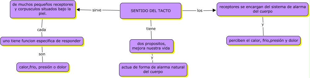 Este Cmap, tiene información relacionada con: SENTIDO DEL TACTO, receptores se encargan del sistema de alarma del cuerpo y perciben el calor, frio,presión y dolor, dos propositos, mejora nuestra vida y actua de forma de alarma natural del cuerpo, SENTIDO DEL TACTO sirve de muchos pequeños receptores y corpusculos situados bajo la piel., de muchos pequeños receptores y corpusculos situados bajo la piel. cada uno tiene funcion especifica de responder, uno tiene funcion especifica de responder son calor,frio, presión o dolor, SENTIDO DEL TACTO los receptores se encargan del sistema de alarma del cuerpo, SENTIDO DEL TACTO tiene dos propositos, mejora nuestra vida