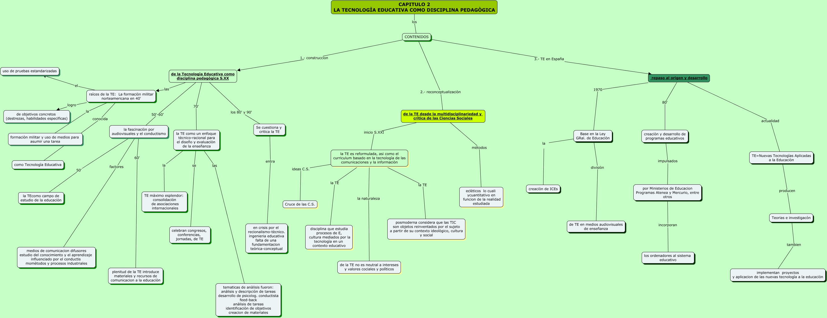 Este Cmap, tiene información relacionada con: capitulo 2, CONTENIDOS 1.- construccion de la Tecnologìa Educativa como disciplina pedagògica S.XX, CAPITULO 2 LA TECNOLOGÌA EDUCATIVA COMO DISCIPLINA PEDAGÒGICA los CONTENIDOS, de la Tecnologìa Educativa como disciplina pedagògica S.XX las raìces de la TE: La formaciòn militar norteamericana en 40', de la TE desde la multidisciplinariedad y crìtica de las Ciencias Sociales mètodos eclèticos lo cuali ycuantitativo en funcion de la realidad estudiada, Base en la Ley GRal. de Educaciòn la creaciòn de ICEs, repaso al origen y desarrollo actualidad TE=Nuevas Tecnologìas Aplicadas a la Educaciòn, Teorias e investigacòn tambien implementan proyectos y aplicacion de las nuevas tecnologìa a la educaciòn, repaso al origen y desarrollo 80' creaciòn y desarrollo de programas educativos, Base en la Ley GRal. de Educaciòn divisiòn de TE en medios audiovisuales de enseñanza, la TE como un enfoque tècnico-racional para el diseño y evaluaciòn de la enseñanza las tematicas de anàlisis fueron: anàlisis y descripciòn de tareas desarrollo de psicolog. conductista feed-back anàlisis de tareas identificaciòn de objetivos creacion de materiales, TE=Nuevas Tecnologìas Aplicadas a la Educaciòn producen Teorias e investigacòn, por Ministerios de Educacion Programas Atenea y Mercurio, entre otros incorporan los ordenadores al sistema educativo, creaciòn y desarrollo de programas educativos impulsados por Ministerios de Educacion Programas Atenea y Mercurio, entre otros, la TE es reformulada, asi como el curriculum basado en la tecnologìa de las comunicaciones y la informaciòn la naturaleza de la TE no es neutral a intereses y valores cociales y polìticos, la TE es reformulada, asi como el curriculum basado en la tecnologìa de las comunicaciones y la informaciòn la TE disciplina que estudia procesos de E, cultura mediados por la tecnologìa en un contexto educativo, la fascinaciòn por audiovisuales y el conductismo 50' la TEcomo campo de estudio de la educaciòn, raìces de la TE: La formaciòn militar norteamericana en 40' conocida como Tecnologìa Educativa, la TE como un enfoque tècnico-racional para el diseño y evaluaciòn de la enseñanza la TE màximo esplendor: consolidaciòn de asociaciones internacionales, raìces de la TE: La formaciòn militar norteamericana en 40' la formaciòn militar y uso de medios para asumir una tarea, Se cuestiona y critica la TE entra en crisis por el recionalismo-tècnico. ingenieria educativa falta de una fundamentacion teòrica-conceptual