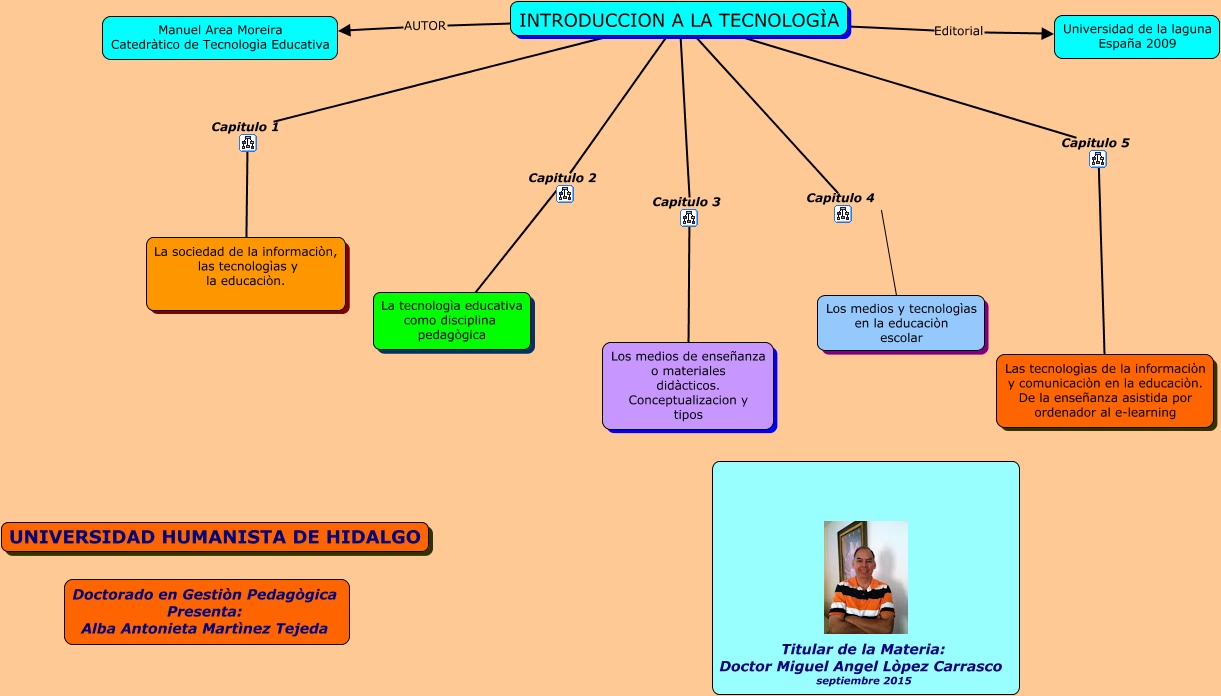 Este Cmap, tiene información relacionada con: leccion capitulada, INTRODUCCION A LA TECNOLOGÌA Capitulo 1 La sociedad de la informaciòn, las tecnologìas y la educaciòn., INTRODUCCION A LA TECNOLOGÌA Capitulo 3 Los medios de enseñanza o materiales didàcticos. Conceptualizacion y tipos, INTRODUCCION A LA TECNOLOGÌA Editorial Universidad de la laguna España 2009, INTRODUCCION A LA TECNOLOGÌA Capitulo 2 La tecnologìa educativa como disciplina pedagògica, INTRODUCCION A LA TECNOLOGÌA Capitulo 5 Las tecnologìas de la informaciòn y comunicaciòn en la educaciòn. De la enseñanza asistida por ordenador al e-learning, INTRODUCCION A LA TECNOLOGÌA Capitulo 4 Los medios y tecnologìas en la educaciòn escolar, INTRODUCCION A LA TECNOLOGÌA AUTOR Manuel Area Moreira Catedràtico de Tecnologìa Educativa