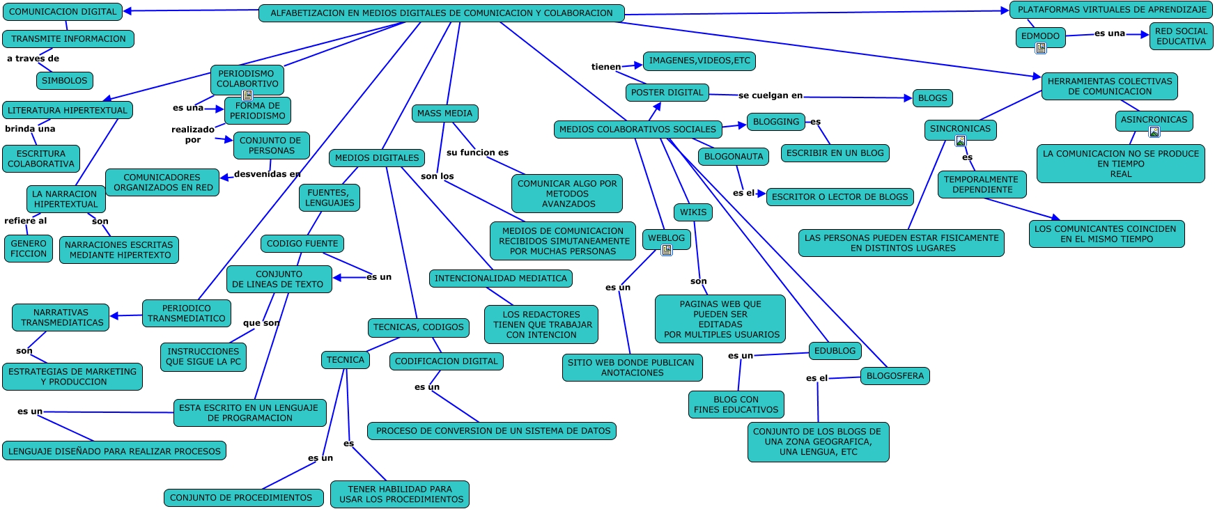 Este Cmap, tiene información relacionada con: CMAP TEORICO 11 MICA CITTADINI, CODIGO FUENTE es un CONJUNTO DE LINEAS DE TEXTO, ALFABETIZACION EN MEDIOS DIGITALES DE COMUNICACION Y COLABORACION ???? MEDIOS COLABORATIVOS SOCIALES, HERRAMIENTAS COLECTIVAS DE COMUNICACION ???? ASINCRONICAS, TEMPORALMENTE DEPENDIENTE ???? LOS COMUNICANTES COINCIDEN EN EL MISMO TIEMPO, MEDIOS COLABORATIVOS SOCIALES ???? BLOGGING, CODIGO FUENTE ???? ESTA ESCRITO EN UN LENGUAJE DE PROGRAMACION, ALFABETIZACION EN MEDIOS DIGITALES DE COMUNICACION Y COLABORACION ???? COMUNICACION DIGITAL, EDMODO es una RED SOCIAL EDUCATIVA, CONJUNTO DE PERSONAS desvenidas en COMUNICADORES ORGANIZADOS EN RED, TECNICAS, CODIGOS ???? CODIFICACION DIGITAL, MEDIOS COLABORATIVOS SOCIALES ???? BLOGOSFERA, HERRAMIENTAS COLECTIVAS DE COMUNICACION ???? SINCRONICAS, PLATAFORMAS VIRTUALES DE APRENDIZAJE ???? EDMODO, MEDIOS DIGITALES ???? FUENTES, LENGUAJES, FORMA DE PERIODISMO realizado por CONJUNTO DE PERSONAS, MEDIOS COLABORATIVOS SOCIALES ???? WEBLOG, ESTA ESCRITO EN UN LENGUAJE DE PROGRAMACION es un LENGUAJE DISEÑADO PARA REALIZAR PROCESOS, NARRATIVAS TRANSMEDIATICAS son ESTRATEGIAS DE MARKETING Y PRODUCCION, ALFABETIZACION EN MEDIOS DIGITALES DE COMUNICACION Y COLABORACION ???? LITERATURA HIPERTEXTUAL, TRANSMITE INFORMACION a traves de SIMBOLOS