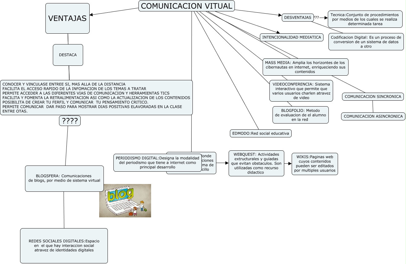 Este Cmap, tiene información relacionada con: FIGUEROA_TP11, ???? ???? REDES SOCIALES DIGITALES:Espacio en el que hay interaccion social atravez de identidades digitales, COMUNICACION VITUAL ???? VIDEOCONFERENCIA: Sistema interactivo que permite que varios usuarios charlen atravez de video, WEBLOG: Sitio donde se publican anotaciones mediante un sistema de publicacion sencillo ???? WEBQUEST: Actividades extructurales y guiadas que evitan obstaculos. Son utilizadas como recurso didactico, ???? ???? BLOGSFERA: Comunicaciones de blogs, por medio de sistema virtual, COMUNICACION SINCRONICA ???? COMUNICACION ASINCRONICA, COMUNICACION VITUAL ???? COMUNICACION SINCRONICA, COMUNICACION VITUAL ???? DESVENTAJAS, VENTAJAS ???? ????, COMUNICACION VITUAL ???? WEBLOG: Sitio donde se publican anotaciones mediante un sistema de publicacion sencillo, COMUNICACION VITUAL ???? BLOGFOLIO: Metodo de evaluacion de el alumno en la red, COMUNICACION VITUAL ???? INTENCIONALIDAD MEDIATICA, COMUNICACION VITUAL ???? VENTAJAS, COMUNICACION VITUAL ???? MASS MEDIA: Amplia los horizontes de los cibernautas en internet, enriqueciendo sus contenidos, DESVENTAJAS ???? Codificacion Digital: Es un proceso de conversion de un sistema de datos a otro, WEBQUEST: Actividades extructurales y guiadas que evitan obstaculos. Son utilizadas como recurso didactico ???? WIKIS:Paginas web cuyos contenidos pueden ser editados por multiples usuarios, DESVENTAJAS ???? Tecnica:Conjunto de procedimientos por medios de los cuales se realiza determinada tarea, COMUNICACION VITUAL ???? EDMODO:Red social educativa