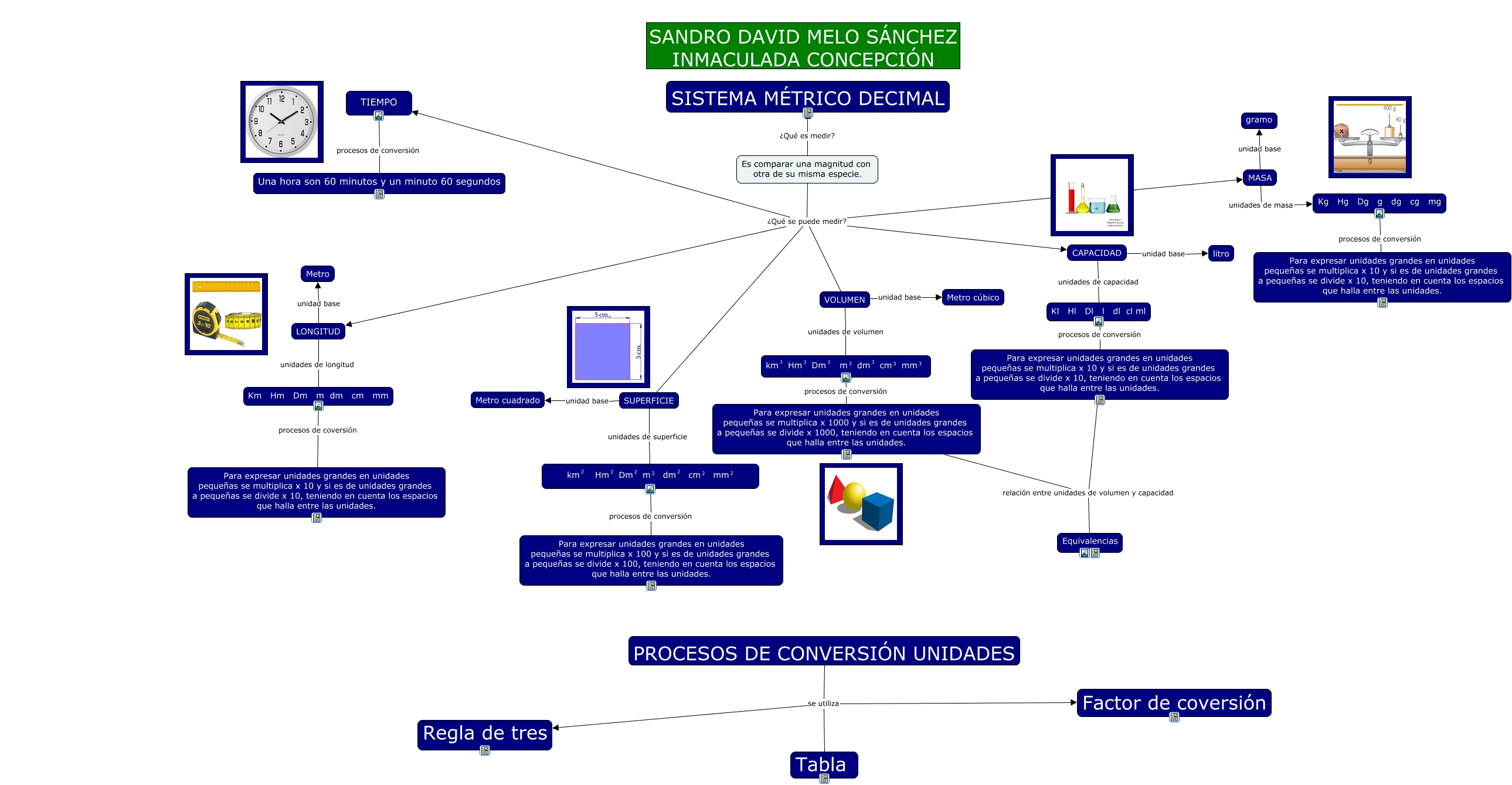 Este Cmap, tiene información relacionada con: SISTEMA MÉTRICO DECIMAL, Es comparar una magnitud con otra de su misma especie. ¿Qué se puede medir? LONGITUD, Para expresar unidades grandes en unidades pequeñas se multiplica x 1000 y si es de unidades grandes a pequeñas se divide x 1000, teniendo en cuenta los espacios que halla entre las unidades. relación entre unidades de volumen y capacidad Equivalencias, SUPERFICIE unidades de superficie <math xmlns="http://www.w3.org/1998/Math/MathML"> <mrow> <mmultiscripts> <mtext> km </mtext> <none/> <mtext> 2 </mtext> </mmultiscripts> <mtext> </mtext> <mmultiscripts> <mtext> Hm </mtext> <none/> <mtext> 2 </mtext> </mmultiscripts> <mtext> </mtext> <mmultiscripts> <mtext> Dm </mtext> <none/> <mtext> 2 </mtext> </mmultiscripts> <mtext> </mtext> <mmultiscripts> <mtext> m </mtext> <none/> <mtext> 2 </mtext> </mmultiscripts> <mtext> </mtext> <mmultiscripts> <mtext> dm </mtext> <none/> <mtext> 2 </mtext> </mmultiscripts> <mtext> </mtext> <mmultiscripts> <mtext> cm </mtext> <none/> <mtext> 2 </mtext> </mmultiscripts> <mtext> </mtext> <mmultiscripts> <mtext> mm </mtext> <none/> <mtext> 2 </mtext> </mmultiscripts> </mrow> </math>, Es comparar una magnitud con otra de su misma especie. ¿Qué se puede medir? CAPACIDAD, Kg Hg Dg g dg cg mg procesos de conversión Para expresar unidades grandes en unidades pequeñas se multiplica x 10 y si es de unidades grandes a pequeñas se divide x 10, teniendo en cuenta los espacios que halla entre las unidades., TIEMPO procesos de conversión Una hora son 60 minutos y un minuto 60 segundos, PROCESOS DE CONVERSIÓN UNIDADES se utiliza Regla de tres, <math xmlns="http://www.w3.org/1998/Math/MathML"> <mrow> <mmultiscripts> <mtext> km </mtext> <none/> <mtext> 2 </mtext> </mmultiscripts> <mtext> </mtext> <mmultiscripts> <mtext> Hm </mtext> <none/> <mtext> 2 </mtext> </mmultiscripts> <mtext> </mtext> <mmultiscripts> <mtext> Dm </mtext> <none/> <mtext> 2 </mtext> </mmultiscripts> <mtext> </mtext> <mmultiscripts> <mtext> m </mtext> <none/> <mtext> 2 </mtext> </mmultiscripts> <mtext> </mtext> <mmultiscripts> <mtext> dm </mtext> <none/> <mtext> 2 </mtext> </mmultiscripts> <mtext> </mtext> <mmultiscripts> <mtext> cm </mtext> <none/> <mtext> 2 </mtext> </mmultiscripts> <mtext> </mtext> <mmultiscripts> <mtext> mm </mtext> <none/> <mtext> 2 </mtext> </mmultiscripts> </mrow> </math> procesos de conversión Para expresar unidades grandes en unidades pequeñas se multiplica x 100 y si es de unidades grandes a pequeñas se divide x 100, teniendo en cuenta los espacios que halla entre las unidades., CAPACIDAD unidades de capacidad Kl Hl Dl l dl cl ml, PROCESOS DE CONVERSIÓN UNIDADES se utiliza Tabla, Kl Hl Dl l dl cl ml procesos de conversión Para expresar unidades grandes en unidades pequeñas se multiplica x 10 y si es de unidades grandes a pequeñas se divide x 10, teniendo en cuenta los espacios que halla entre las unidades., Es comparar una magnitud con otra de su misma especie. ¿Qué se puede medir? TIEMPO, LONGITUD unidad base Metro, PROCESOS DE CONVERSIÓN UNIDADES se utiliza Factor de coversión, MASA unidades de masa Kg Hg Dg g dg cg mg, LONGITUD unidades de longitud Km Hm Dm m dm cm mm, Es comparar una magnitud con otra de su misma especie. ¿Qué es medir? SISTEMA MÉTRICO DECIMAL, Km Hm Dm m dm cm mm procesos de coversión Para expresar unidades grandes en unidades pequeñas se multiplica x 10 y si es de unidades grandes a pequeñas se divide x 10, teniendo en cuenta los espacios que halla entre las unidades., Para expresar unidades grandes en unidades pequeñas se multiplica x 10 y si es de unidades grandes a pequeñas se divide x 10, teniendo en cuenta los espacios que halla entre las unidades. relación entre unidades de volumen y capacidad Equivalencias, CAPACIDAD unidad base litro