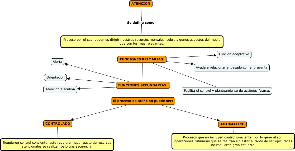 Este Cmap, tiene información relacionada con: atencion, El proceso de atencion puede ser: ???? AUTOMATICO, El proceso de atencion puede ser: ???? CONTROLADO, FUNCIONES SECUNDARIAS: Alerta, Proceso por el cual podemos dirigir nuestros recursos mentales sobre algunos aspectos del medio que son los mas relevantes. FUNCIONES: Facilita el control y planteamiento de acciones futuras, FUNCIONES PRIMARIAS: ???? FUNCIONES SECUNDARIAS:, FUNCIONES SECUNDARIAS: Atencion ejecutiva, FUNCIONES SECUNDARIAS: ???? El proceso de atencion puede ser:, ATENCION Se define como: Proceso por el cual podemos dirigir nuestros recursos mentales sobre algunos aspectos del medio que son los mas relevantes., Proceso por el cual podemos dirigir nuestros recursos mentales sobre algunos aspectos del medio que son los mas relevantes. FUNCIONES: Funcion adaptativa, CONTROLADO Requieren control conciente, esto requiere mayor gasto de recursos atencionales se realizan bajo una secuencia., FUNCIONES SECUNDARIAS: Orientacion, Proceso por el cual podemos dirigir nuestros recursos mentales sobre algunos aspectos del medio que son los mas relevantes. FUNCIONES: Ayuda a relacionar el pasado con el presente, AUTOMATICO ???? Procesos que no incluyen control conciente, por lo general son operaciones rutinarias que se realizan sin estar al tanto de ser ejecutadas no requieren gran esfuerzo.