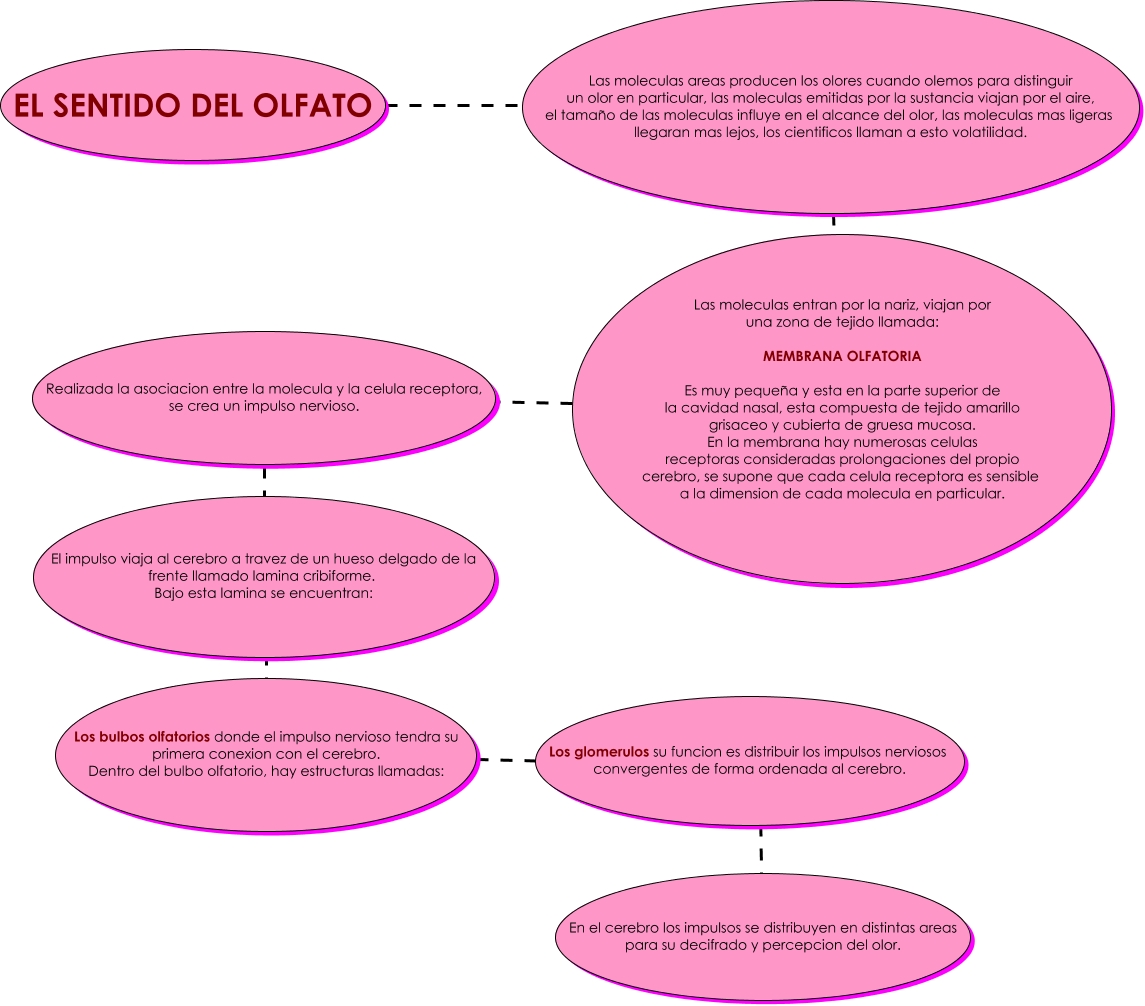Este Cmap, tiene información relacionada con: sentido del olfato, Los glomerulos su funcion es distribuir los impulsos nerviosos convergentes de forma ordenada al cerebro. ???? En el cerebro los impulsos se distribuyen en distintas areas para su decifrado y percepcion del olor., Realizada la asociacion entre la molecula y la celula receptora, se crea un impulso nervioso. ???? El impulso viaja al cerebro a travez de un hueso delgado de la frente llamado lamina cribiforme. Bajo esta lamina se encuentran:, Las moleculas areas producen los olores cuando olemos para distinguir un olor en particular, las moleculas emitidas por la sustancia viajan por el aire, el tamaño de las moleculas influye en el alcance del olor, las moleculas mas ligeras llegaran mas lejos, los cientificos llaman a esto volatilidad. ???? Las moleculas entran por la nariz, viajan por una zona de tejido llamada: MEMBRANA OLFATORIA Es muy pequeña y esta en la parte superior de la cavidad nasal, esta compuesta de tejido amarillo grisaceo y cubierta de gruesa mucosa. En la membrana hay numerosas celulas receptoras consideradas prolongaciones del propio cerebro, se supone que cada celula receptora es sensible a la dimension de cada molecula en particular., EL SENTIDO DEL OLFATO ???? Las moleculas areas producen los olores cuando olemos para distinguir un olor en particular, las moleculas emitidas por la sustancia viajan por el aire, el tamaño de las moleculas influye en el alcance del olor, las moleculas mas ligeras llegaran mas lejos, los cientificos llaman a esto volatilidad., Las moleculas entran por la nariz, viajan por una zona de tejido llamada: MEMBRANA OLFATORIA Es muy pequeña y esta en la parte superior de la cavidad nasal, esta compuesta de tejido amarillo grisaceo y cubierta de gruesa mucosa. En la membrana hay numerosas celulas receptoras consideradas prolongaciones del propio cerebro, se supone que cada celula receptora es sensible a la dimension de cada molecula en particular. ???? Realizada la asociacion entre la molecula y la celula receptora, se crea un impulso nervioso., Los bulbos olfatorios donde el impulso nervioso tendra su primera conexion con el cerebro. Dentro del bulbo olfatorio, hay estructuras llamadas: ???? Los glomerulos su funcion es distribuir los impulsos nerviosos convergentes de forma ordenada al cerebro., El impulso viaja al cerebro a travez de un hueso delgado de la frente llamado lamina cribiforme. Bajo esta lamina se encuentran: ???? Los bulbos olfatorios donde el impulso nervioso tendra su primera conexion con el cerebro. Dentro del bulbo olfatorio, hay estructuras llamadas: