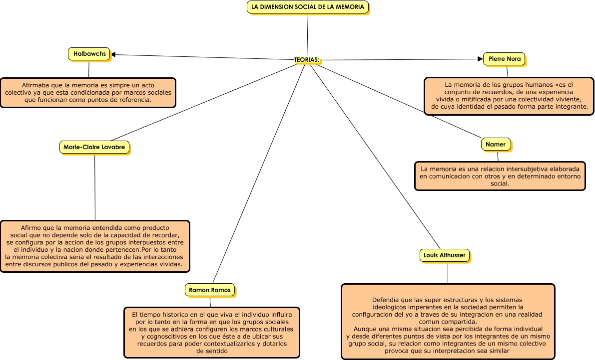 Este Cmap, tiene información relacionada con: dimension, LA DIMENSION SOCIAL DE LA MEMORIA TEORIAS: Halbawchs, LA DIMENSION SOCIAL DE LA MEMORIA TEORIAS: Louis Althusser, Ramon Ramos ???? El tiempo historico en el que viva el individuo influira por lo tanto en la forma en que los grupos sociales en los que se adhiera configuren los marcos culturales y cognoscitivos en los que éste a de ubicar sus recuerdos para poder contextualizarlos y dotarlos de sentido, LA DIMENSION SOCIAL DE LA MEMORIA TEORIAS: Ramon Ramos, Marie-Claire Lavabre ???? Afirmo que la memoria entendida como producto social que no depende solo de la capacidad de recordar, se configura por la accion de los grupos interpuestos entre el individuo y la nacion donde pertenecen.Por lo tanto la memoria colectiva seria el resultado de las interacciones entre discursos publicos del pasado y experiencias vividas., LA DIMENSION SOCIAL DE LA MEMORIA TEORIAS: Pierre Nora, Pierre Nora ???? La memoria de los grupos humanos «es el conjunto de recuerdos, de una experiencia vivida o mitificada por una colectividad viviente, de cuya identidad el pasado forma parte integrante., LA DIMENSION SOCIAL DE LA MEMORIA TEORIAS: Namer, LA DIMENSION SOCIAL DE LA MEMORIA TEORIAS: Marie-Claire Lavabre, Namer ???? La memoria es una relacion intersubjetiva elaborada en comunicacion con otros y en determinado entorno social., Louis Althusser ???? Defendia que las super estructuras y los sistemas ideologicos imperantes en la sociedad permiten la configuracion del yo a traves de su integracion en una realidad comun compartida. Aunque una misma situacion sea percibida de forma individual y desde diferentes puntos de vista por los integrantes de un mismo grupo social, su relacion como integrantes de un mismo colectivo provoca que su interpretacion sea similar, Halbawchs ???? Afirmaba que la memoria es simpre un acto colectivo ya que esta condicionada por marcos sociales que funcionan como puntos de referencia.