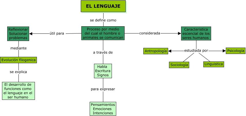 Este Cmap, tiene información relacionada con: EL LEGUAJE, Caracteristica escencial de los seres humanos estudiada por Linguistica, Proceso por medio del cual el hombre o animales se comunican a través de Habla Escritura Signos, Caracteristica escencial de los seres humanos estudiada por Psicología, Habla Escritura Signos para expresar Pensamientos Emociones Intenciones, Reflexionar Solucionar problemas mediante Evolución filogenica, Caracteristica escencial de los seres humanos estudiada por Sociología, Proceso por medio del cual el hombre o animales se comunican considerada Caracteristica escencial de los seres humanos, Proceso por medio del cual el hombre o animales se comunican útil para Reflexionar Solucionar problemas, EL LENGUAJE se define como Proceso por medio del cual el hombre o animales se comunican, Evolución filogenica se explica El desarrollo de funciones como el lenguaje en el ser humano, Caracteristica escencial de los seres humanos estudiada por Antropología