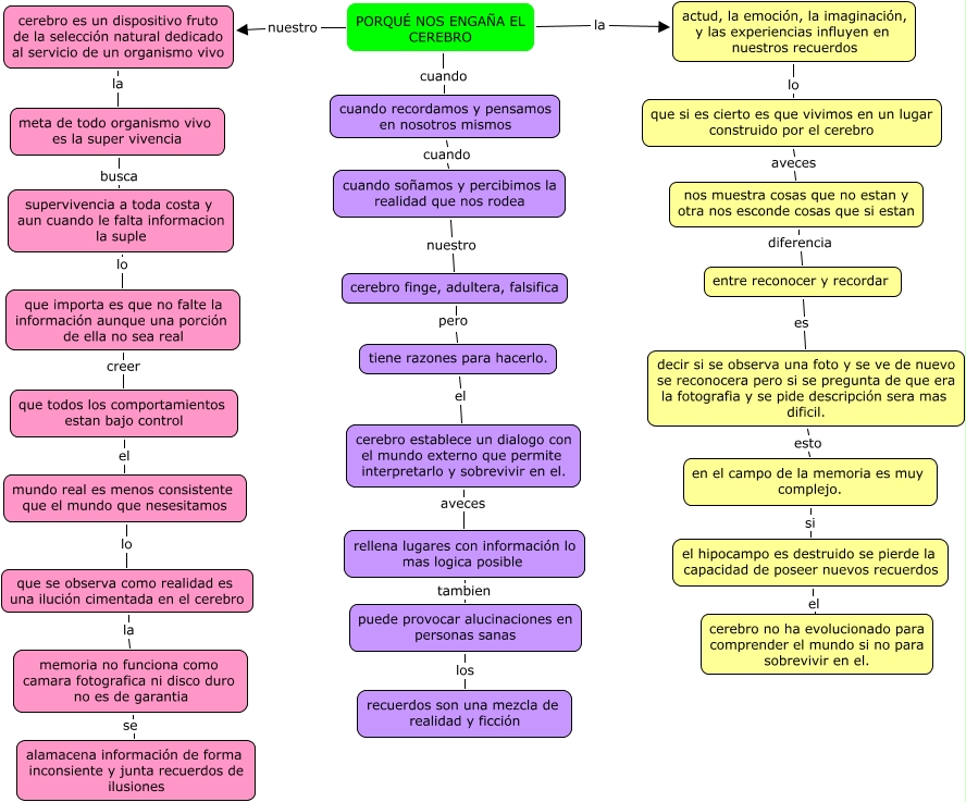 Este Cmap, tiene información relacionada con: PORQUÉ NOS ENGAÑA EL CEREBRO, decir si se observa una foto y se ve de nuevo se reconocera pero si se pregunta de que era la fotografia y se pide descripción sera mas dificil. esto en el campo de la memoria es muy complejo., nos muestra cosas que no estan y otra nos esconde cosas que si estan diferencia entre reconocer y recordar, cerebro es un dispositivo fruto de la selección natural dedicado al servicio de un organismo vivo la meta de todo organismo vivo es la super vivencia, entre reconocer y recordar es decir si se observa una foto y se ve de nuevo se reconocera pero si se pregunta de que era la fotografia y se pide descripción sera mas dificil., rellena lugares con información lo mas logica posible tambien puede provocar alucinaciones en personas sanas, cuando soñamos y percibimos la realidad que nos rodea nuestro cerebro finge, adultera, falsifica, PORQUÉ NOS ENGAÑA EL CEREBRO la actud, la emoción, la imaginación, y las experiencias influyen en nuestros recuerdos, cerebro finge, adultera, falsifica pero tiene razones para hacerlo., que si es cierto es que vivimos en un lugar construido por el cerebro aveces nos muestra cosas que no estan y otra nos esconde cosas que si estan, PORQUÉ NOS ENGAÑA EL CEREBRO nuestro cerebro es un dispositivo fruto de la selección natural dedicado al servicio de un organismo vivo, mundo real es menos consistente que el mundo que nesesitamos lo que se observa como realidad es una ilución cimentada en el cerebro, puede provocar alucinaciones en personas sanas los recuerdos son una mezcla de realidad y ficción, que todos los comportamientos estan bajo control el mundo real es menos consistente que el mundo que nesesitamos, memoria no funciona como camara fotografica ni disco duro no es de garantia se alamacena información de forma inconsiente y junta recuerdos de ilusiones, PORQUÉ NOS ENGAÑA EL CEREBRO cuando cuando recordamos y pensamos en nosotros mismos, que se observa como realidad es una ilución cimentada en el cerebro la memoria no funciona como camara fotografica ni disco duro no es de garantia, cuando recordamos y pensamos en nosotros mismos cuando cuando soñamos y percibimos la realidad que nos rodea, actud, la emoción, la imaginación, y las experiencias influyen en nuestros recuerdos lo que si es cierto es que vivimos en un lugar construido por el cerebro, meta de todo organismo vivo es la super vivencia busca supervivencia a toda costa y aun cuando le falta informacion la suple, en el campo de la memoria es muy complejo. si el hipocampo es destruido se pierde la capacidad de poseer nuevos recuerdos