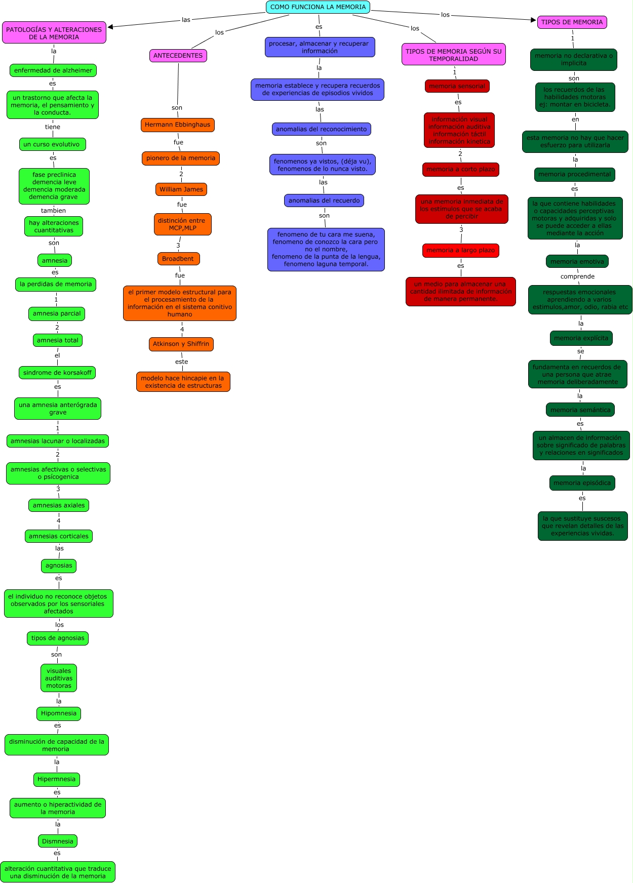 Este Cmap, tiene información relacionada con: COMO FUNCIONA LA MEMORIA, procesar, almacenar y recuperar información la memoria establece y recupera recuerdos de experiencias de episodios vividos, una memoria inmediata de los estímulos que se acaba de percibir 3 memoria a largo plazo, distinción entre MCP,MLP 3 Broadbent, COMO FUNCIONA LA MEMORIA los TIPOS DE MEMORIA SEGÚN SU TEMPORALIDAD, Hipermnesia es aumento o hiperactividad de la memoria, COMO FUNCIONA LA MEMORIA los ANTECEDENTES, William James fue distinción entre MCP,MLP, un curso evolutivo es fase preclinica demencia leve demencia moderada demencia grave, Broadbent fue el primer modelo estructural para el procesamiento de la información en el sistema conitivo humano, los recuerdos de las habilidades motoras ej: montar en bicicleta. en esta memoria no hay que hacer esfuerzo para utilizarla, el individuo no reconoce objetos observados por los sensoriales afectados los tipos de agnosias, fundamenta en recuerdos de una persona que atrae memoria deliberadamente la memoria semántica, amnesias lacunar o localizadas 2 amnesias afectivas o selectivas o psícogenica, la que contiene habilidades o capacidades perceptivas motoras y adquiridas y solo se puede acceder a ellas mediante la acción la memoria emotiva, el primer modelo estructural para el procesamiento de la información en el sistema conitivo humano 4 Atkinson y Shiffrin, agnosias es el individuo no reconoce objetos observados por los sensoriales afectados, memoria explícita se fundamenta en recuerdos de una persona que atrae memoria deliberadamente, esta memoria no hay que hacer esfuerzo para utilizarla la memoria procedimental, amnesia total el sindrome de korsakoff, respuestas emocionales aprendiendo a varios estimulos,amor, odio, rabia etc la memoria explícita