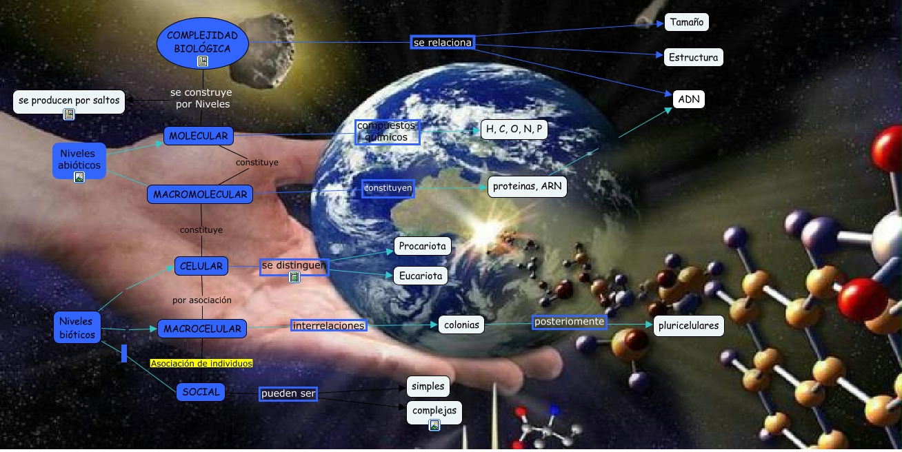 Este Cmap, tiene información relacionada con: complejidad biológica, COMPLEJIDAD BIOLÓGICA se construye por Niveles MOLECULAR, Niveles bióticos CELULAR, COMPLEJIDAD BIOLÓGICA se relaciona Estructura, CELULAR se distinguen Procariota, CELULAR por asociación MACROCELULAR, SOCIAL pueden ser complejas, MACROMOLECULAR Niveles abióticos MOLECULAR, MOLECULAR constituye MACROMOLECULAR, MACROCELULAR interrelaciones colonias, COMPLEJIDAD BIOLÓGICA se relaciona ADN, SOCIAL pueden ser simples, proteinas, ARN ???? ADN, COMPLEJIDAD BIOLÓGICA se construye por Niveles se producen por saltos, Niveles bióticos MACROCELULAR, MACROMOLECULAR constituye CELULAR, MACROMOLECULAR constituyen proteinas, ARN, colonias posteriomente pluricelulares, MOLECULAR compuestos químicos H, C, O, N, P, COMPLEJIDAD BIOLÓGICA se relaciona Tamaño, MACROCELULAR Asociación de individuos SOCIAL