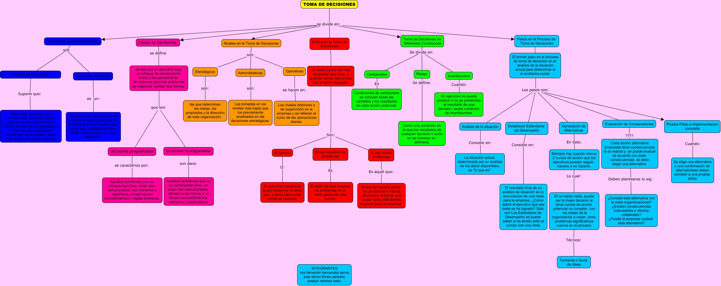 Este Cmap, tiene información relacionada con: Mapa conceptual, Evaluación de Consecuencias ???? Cada acción alternativa propuesta tiene consecuencias si se realiza y se puede evaluar de acuerdo con esas consecuencias. se debe elegir una alternativa, Decisiones no programadas son para: Aquellos problemas que no se comprenden bien, no estan bien estructurados, tienden a ser únicos y no llevan a procedimientos rutinarios o sistemáticos., El que resuelve los problemas Es El estilo del que resuelve los problemas es el estilo gerencial más común., Un estilo puede ser más aceptable que otros, y quienes toman decisiones con el estilo deseado. Son: El Sereno, Niveles en la Toma de Decisiones son: Administrativas, TOMA DE DECISIONES se divide en: Pasos en el Proceso de Toma de Decisiones, Toma de Decisiones en Diferentes Condiciones Se divide en: Incertidumbre, Establecer Estándares de Desempeño Consiste en: El resultado final de un análisis de situación es la enunciación de una meta para la empresa, ¿Cómo sabrá el ejecutivo que esa meta se ha logrado? Sólo con Los Estándares de Desempeño se puede saber si ha tenido éxito al cumpir con una meta., El no hacer nada, puede ser la mejor decisión si otros cursos de acción potencial no cumplen con las metas de la organización o crean otros problemas significativos nuevos en el proceso. Técnica: Tormenta o lluvia de ideas, TOMA DE DECISIONES se divide en: Estilos en la Toma de Decisiones, El primer paso en el proceso de toma de deciones en el análisis de la situación actual para determinar si el problema existe. Los pasos son: Prueba Piloto e implementación completa, El que busca problemas Es aquél que: Busca de manera activa los problemas e intenta afrontarlos antes de que surjan como dificultades mayores para la empresa., Prueba Piloto e implementación completa Cuando: Se elige una alternativa o una combinación de alternativasse deben someter a una prueba piloto, Clases de Decisiones se define ya sea que un ejecutivo siga el enfoque de pensamiento lineal o del pensamiento de sistemas para los problemas de negocios existen dos formas, ya sea que un ejecutivo siga el enfoque de pensamiento lineal o del pensamiento de sistemas para los problemas de negocios existen dos formas que son Decisiones no programadas, ya sea que un ejecutivo siga el enfoque de pensamiento lineal o del pensamiento de sistemas para los problemas de negocios existen dos formas que son decisones programadas, Un estilo puede ser más aceptable que otros, y quienes toman decisiones con el estilo deseado. Son: El que busca problemas, El Sereno O: El que evita problemas busca preservar el statu quo, y actúa para evitar introducir cambios., Corrientes de Pensamientos son Teoria de Sistemas, Certidumbre En Condiciones de certidumbre se conocen todas las variables y los resultados de cada accion potencial.