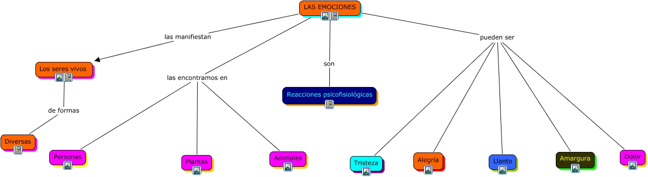 Este Cmap, tiene información relacionada con: LAS EMOCIONES, LAS EMOCIONES pueden ser Amargura, LAS EMOCIONES pueden ser Dolor, LAS EMOCIONES las encontramos en Plantas, LAS EMOCIONES las manifiestan Los seres vivos, LAS EMOCIONES pueden ser Tristeza, LAS EMOCIONES las encontramos en Animales, LAS EMOCIONES pueden ser Llanto, Los seres vivos de formas Diversas, LAS EMOCIONES son Reacciones psicofisiológicas, LAS EMOCIONES pueden ser Alegría, LAS EMOCIONES las encontramos en Personas