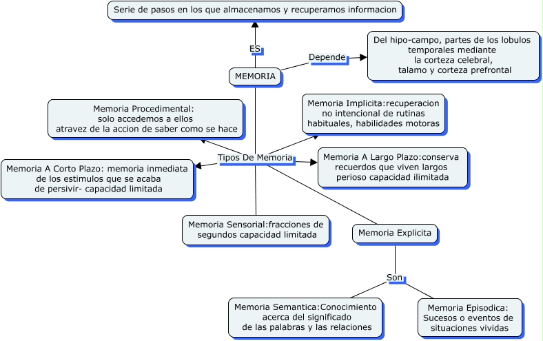 Este Cmap, tiene información relacionada con: Memoria 7, MEMORIA Tipos De Memoria Memoria A Largo Plazo:conserva recuerdos que viven largos perioso capacidad ilimitada, MEMORIA Tipos De Memoria Memoria Procedimental: solo accedemos a ellos atravez de la accion de saber como se hace, MEMORIA Tipos De Memoria Memoria Sensorial:fracciones de segundos capacidad limitada, MEMORIA Tipos De Memoria Memoria Explicita, Memoria Explicita Son Memoria Episodica: Sucesos o eventos de situaciones vividas, MEMORIA Tipos De Memoria Memoria Implicita:recuperacion no intencional de rutinas habituales, habilidades motoras, MEMORIA Tipos De Memoria Memoria A Corto Plazo: memoria inmediata de los estimulos que se acaba de persivir- capacidad limitada, Memoria Explicita Son Memoria Semantica:Conocimiento acerca del significado de las palabras y las relaciones, MEMORIA ES Serie de pasos en los que almacenamos y recuperamos informacion, MEMORIA Depende Del hipo-campo, partes de los lobulos temporales mediante la corteza celebral, talamo y corteza prefrontal