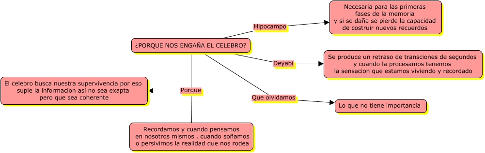 Este Cmap, tiene información relacionada con: Porque nos engaña el celebro 6, ¿PORQUE NOS ENGAÑA EL CELEBRO? Que olvidamos Lo que no tiene importancia, ¿PORQUE NOS ENGAÑA EL CELEBRO? Porque El celebro busca nuestra supervivencia por eso suple la informacion asi no sea exapta pero que sea coherente, ¿PORQUE NOS ENGAÑA EL CELEBRO? Hipocampo Necesaria para las primeras fases de la memoria y si se daña se pierde la capacidad de costruir nuevos recuerdos, ¿PORQUE NOS ENGAÑA EL CELEBRO? Deyabi Se produce un retraso de transciones de segundos y cuando la procesamos tenemos la sensacion que estamos viviendo y recordado, ¿PORQUE NOS ENGAÑA EL CELEBRO? Porque Recordamos y cuando pensamos en nosotros mismos , cuando soñamos o persivimos la realidad que nos rodea