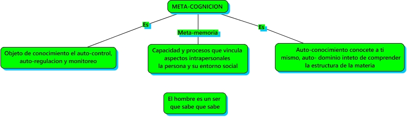 Este Cmap, tiene información relacionada con: META-COGNICION 3, META-COGNICION Es Objeto de conocimiento el auto-control, auto-regulacion y monitoreo, META-COGNICION Es Auto-conocimiento conocete a ti mismo, auto- dominio inteto de comprender la estructura de la materia, META-COGNICION Meta-memoria Capacidad y procesos que vincula aspectos intrapersonales la persona y su entorno social