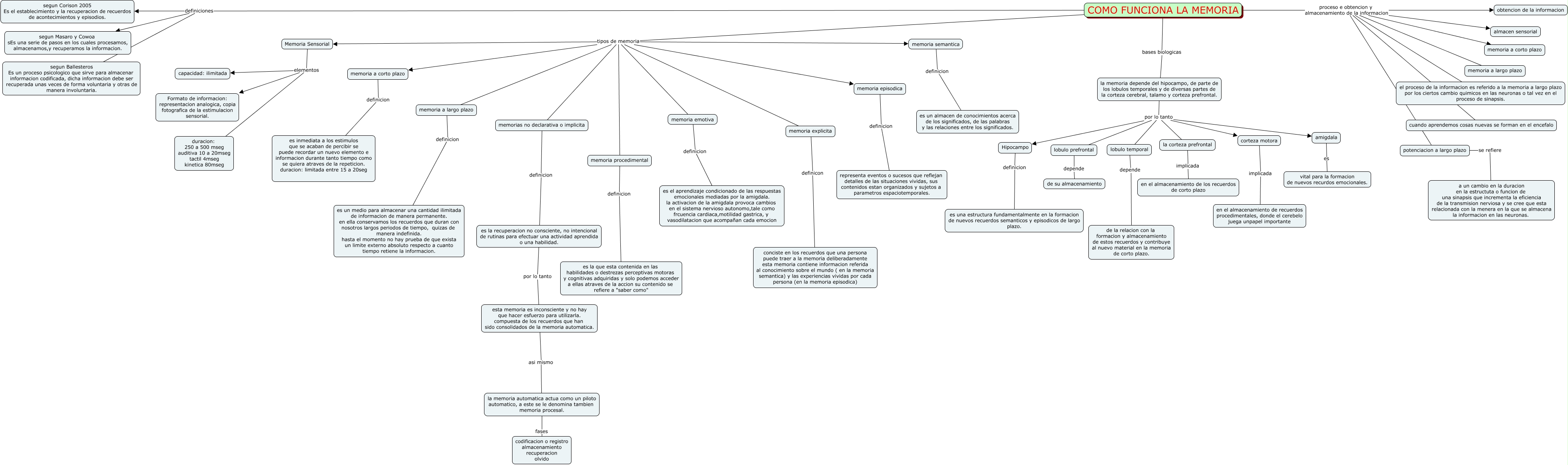 Este Cmap, tiene información relacionada con: como funcioNA la memoria, esta memoria es inconsciente y no hay que hacer esfuerzo para utilizarla. compuesta de los recuerdos que han sido consolidados de la memoria automatica. asi mismo la memoria automatica actua como un piloto automatico, a este se le denomina tambien memoria procesal., la memoria depende del hipocampo, de parte de los lobulos temporales y de diversas partes de la corteza cerebral, talamo y corteza prefrontal. por lo tanto Hipocampo, la memoria depende del hipocampo, de parte de los lobulos temporales y de diversas partes de la corteza cerebral, talamo y corteza prefrontal. por lo tanto lobulo prefrontal, COMO FUNCIONA LA MEMORIA bases biologicas la memoria depende del hipocampo, de parte de los lobulos temporales y de diversas partes de la corteza cerebral, talamo y corteza prefrontal., memoria semantica definicion es un almacen de conocimientos acerca de los significados, de las palabras y las relaciones entre los significados., COMO FUNCIONA LA MEMORIA tipos de memoria memoria emotiva, COMO FUNCIONA LA MEMORIA proceso e obtencion y almacenamiento de la informacion el proceso de la informacion es referido a la memoria a largo plazo por los ciertos cambio quimicos en las neuronas o tal vez en el proceso de sinapsis., es la recuperacion no consciente, no intencional de rutinas para efectuar una actividad aprendida o una habilidad. por lo tanto esta memoria es inconsciente y no hay que hacer esfuerzo para utilizarla. compuesta de los recuerdos que han sido consolidados de la memoria automatica., la memoria depende del hipocampo, de parte de los lobulos temporales y de diversas partes de la corteza cerebral, talamo y corteza prefrontal. por lo tanto la corteza prefrontal, COMO FUNCIONA LA MEMORIA tipos de memoria memoria a largo plazo, Memoria Sensorial elementos Formato de informacion: representacion analogica, copia fotografica de la estimulacion sensorial., la memoria depende del hipocampo, de parte de los lobulos temporales y de diversas partes de la corteza cerebral, talamo y corteza prefrontal. por lo tanto amigdala, la corteza prefrontal implicada en el almacenamiento de los recuerdos de corto plazo, COMO FUNCIONA LA MEMORIA definiciones segun Masaro y Cowoa sEs una serie de pasos en los cuales procesamos, almacenamos,y recuperamos la informacion., amigdala es vital para la formacion de nuevos recurdos emocionales., memoria emotiva definicion es el aprendizaje condicionado de las respuestas emocionales mediadas por la amigdala. la activacion de la amigdala provoca cambios en el sistema nervioso autonomo,tale como frcuencia cardiaca,motilidad gastrica, y vasodilatacion que acompañan cada emocion, corteza motora implicada en el almacenamiento de recuerdos procedimentales, donde el cerebelo juega unpapel importante, Hipocampo definicion es una estructura fundamentalmente en la formacion de nuevos recuerdos semanticos y episodicos de largo plazo., COMO FUNCIONA LA MEMORIA tipos de memoria memorias no declarativa o implicita, la memoria depende del hipocampo, de parte de los lobulos temporales y de diversas partes de la corteza cerebral, talamo y corteza prefrontal. por lo tanto lobulo temporal