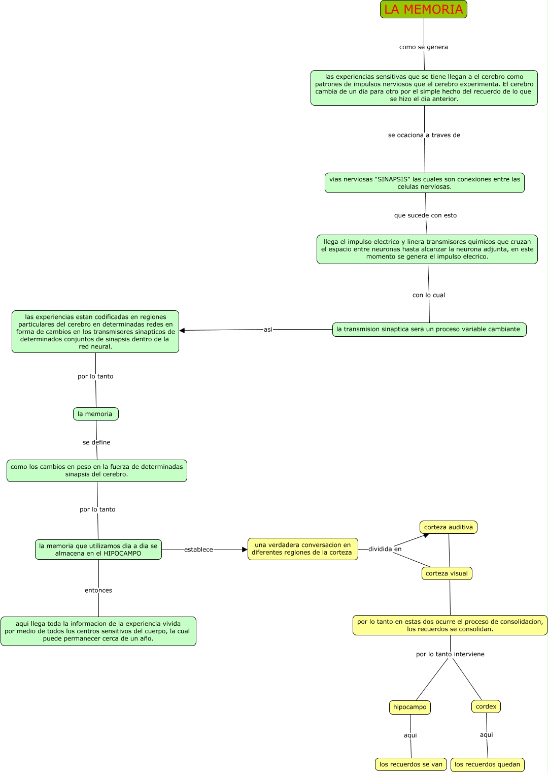 Este Cmap, tiene información relacionada con: la memoria, la memoria se define como los cambios en peso en la fuerza de determinadas sinapsis del cerebro., vias nerviosas "SINAPSIS" las cuales son conexiones entre las celulas nerviosas. que sucede con esto llega el impulso electrico y linera transmisores quimicos que cruzan el espacio entre neuronas hasta alcanzar la neurona adjunta, en este momento se genera el impulso elecrico., la memoria que utilizamos dia a dia se almacena en el HIPOCAMPO establece una verdadera conversacion en diferentes regiones de la corteza, llega el impulso electrico y linera transmisores quimicos que cruzan el espacio entre neuronas hasta alcanzar la neurona adjunta, en este momento se genera el impulso elecrico. con lo cual la transmision sinaptica sera un proceso variable cambiante, las experiencias estan codificadas en regiones particulares del cerebro en determinadas redes en forma de cambios en los transmisores sinapticos de determinados conjuntos de sinapsis dentro de la red neural. por lo tanto la memoria, la memoria que utilizamos dia a dia se almacena en el HIPOCAMPO entonces aqui llega toda la informacion de la experiencia vivida por medio de todos los centros sensitivos del cuerpo, la cual puede permanecer cerca de un año., LA MEMORIA como se genera las experiencias sensitivas que se tiene llegan a el cerebro como patrones de impulsos nerviosos que el cerebro experimenta. El cerebro cambia de un dia para otro por el simple hecho del recuerdo de lo que se hizo el dia anterior., una verdadera conversacion en diferentes regiones de la corteza dividida en corteza auditiva, hipocampo aqui los recuerdos se van, cordex aqui los recuerdos quedan, la transmision sinaptica sera un proceso variable cambiante asi las experiencias estan codificadas en regiones particulares del cerebro en determinadas redes en forma de cambios en los transmisores sinapticos de determinados conjuntos de sinapsis dentro de la red neural., por lo tanto en estas dos ocurre el proceso de consolidacion, los recuerdos se consolidan. por lo tanto interviene hipocampo, corteza auditiva ???? por lo tanto en estas dos ocurre el proceso de consolidacion, los recuerdos se consolidan., las experiencias sensitivas que se tiene llegan a el cerebro como patrones de impulsos nerviosos que el cerebro experimenta. El cerebro cambia de un dia para otro por el simple hecho del recuerdo de lo que se hizo el dia anterior. se ocaciona a traves de vias nerviosas "SINAPSIS" las cuales son conexiones entre las celulas nerviosas., por lo tanto en estas dos ocurre el proceso de consolidacion, los recuerdos se consolidan. por lo tanto interviene cordex, como los cambios en peso en la fuerza de determinadas sinapsis del cerebro. por lo tanto la memoria que utilizamos dia a dia se almacena en el HIPOCAMPO, una verdadera conversacion en diferentes regiones de la corteza dividida en corteza visual
