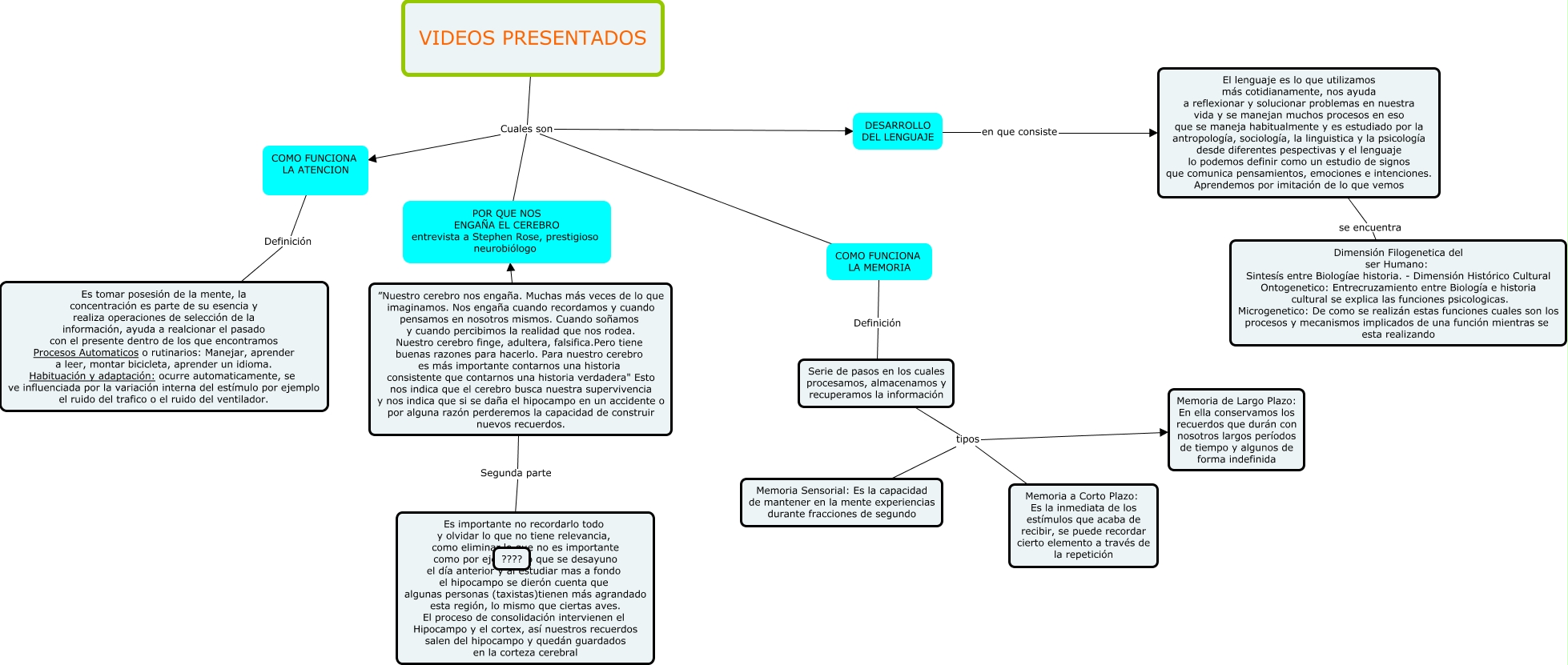 Este Cmap, tiene información relacionada con: VIDEOS Atención - Cerebro- Memoria, Serie de pasos en los cuales procesamos, almacenamos y recuperamos la información tipos Memoria Sensorial: Es la capacidad de mantener en la mente experiencias durante fracciones de segundo, Serie de pasos en los cuales procesamos, almacenamos y recuperamos la información tipos Memoria de Largo Plazo: En ella conservamos los recuerdos que durán con nosotros largos períodos de tiempo y algunos de forma indefinida, El lenguaje es lo que utilizamos más cotidianamente, nos ayuda a reflexionar y solucionar problemas en nuestra vida y se manejan muchos procesos en eso que se maneja habitualmente y es estudiado por la antropología, sociología, la linguistica y la psicología desde diferentes pespectivas y el lenguaje lo podemos definir como un estudio de signos que comunica pensamientos, emociones e intenciones. Aprendemos por imitación de lo que vemos se encuentra Dimensión Filogenetica del ser Humano: Sintesís entre Biologíae historia. - Dimensión Histórico Cultural Ontogenetico: Entrecruzamiento entre Biología e historia cultural se explica las funciones psicologicas. Microgenetico: De como se realizán estas funciones cuales son los procesos y mecanismos implicados de una función mientras se esta realizando, COMO FUNCIONA LA MEMORIA Definición Serie de pasos en los cuales procesamos, almacenamos y recuperamos la información, VIDEOS PRESENTADOS Cuales son COMO FUNCIONA LA MEMORIA, VIDEOS PRESENTADOS Cuales son DESARROLLO DEL LENGUAJE, VIDEOS PRESENTADOS Cuales son COMO FUNCIONA LA ATENCION, COMO FUNCIONA LA ATENCION Definición Es tomar posesión de la mente, la concentración es parte de su esencia y realiza operaciones de selección de la información, ayuda a realcionar el pasado con el presente dentro de los que encontramos Procesos Automaticos o rutinarios: Manejar, aprender a leer, montar bicicleta, aprender un idioma. Habituación y adaptación: ocurre automaticamente, se ve influenciada por la variación interna del estímulo por ejemplo el ruido del trafico o el ruido del ventilador., VIDEOS PRESENTADOS Cuales son POR QUE NOS ENGAÑA EL CEREBRO entrevista a Stephen Rose, prestigioso neurobiólogo, ”Nuestro cerebro nos engaña. Muchas más veces de lo que imaginamos. Nos engaña cuando recordamos y cuando pensamos en nosotros mismos. Cuando soñamos y cuando percibimos la realidad que nos rodea. Nuestro cerebro finge, adultera, falsifica.Pero tiene buenas razones para hacerlo. Para nuestro cerebro es más importante contarnos una historia consistente que contarnos una historia verdadera" Esto nos indica que el cerebro busca nuestra supervivencia y nos indica que si se daña el hipocampo en un accidente o por alguna razón perderemos la capacidad de construir nuevos recuerdos. Segunda parte ????, DESARROLLO DEL LENGUAJE en que consiste El lenguaje es lo que utilizamos más cotidianamente, nos ayuda a reflexionar y solucionar problemas en nuestra vida y se manejan muchos procesos en eso que se maneja habitualmente y es estudiado por la antropología, sociología, la linguistica y la psicología desde diferentes pespectivas y el lenguaje lo podemos definir como un estudio de signos que comunica pensamientos, emociones e intenciones. Aprendemos por imitación de lo que vemos, Serie de pasos en los cuales procesamos, almacenamos y recuperamos la información tipos Memoria a Corto Plazo: Es la inmediata de los estímulos que acaba de recibir, se puede recordar cierto elemento a través de la repetición, ”Nuestro cerebro nos engaña. Muchas más veces de lo que imaginamos. Nos engaña cuando recordamos y cuando pensamos en nosotros mismos. Cuando soñamos y cuando percibimos la realidad que nos rodea. Nuestro cerebro finge, adultera, falsifica.Pero tiene buenas razones para hacerlo. Para nuestro cerebro es más importante contarnos una historia consistente que contarnos una historia verdadera" Esto nos indica que el cerebro busca nuestra supervivencia y nos indica que si se daña el hipocampo en un accidente o por alguna razón perderemos la capacidad de construir nuevos recuerdos. ???? POR QUE NOS ENGAÑA EL CEREBRO entrevista a Stephen Rose, prestigioso neurobiólogo