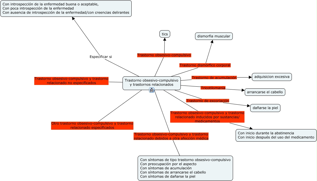 Este Cmap, tiene información relacionada con: Trastorno obsesivo-compulsivo y trastornos relacionados 6 index, Trastorno obsesivo-compulsivo y trastornos relacionados Trastorno obsesivo-compulsivo y trastorno relacionado no especificados ????, Trastorno obsesivo-compulsivo y trastornos relacionados Trastorno de acumulación adquisicion excesiva, Trastorno obsesivo-compulsivo y trastornos relacionados Trastorno obsesivo-compulsivo y trastorno relacionado inducidos por sustancias/ medicamentos Con inicio durante la abstinencia Con inicio después del uso del medicamento, Trastorno obsesivo-compulsivo y trastornos relacionados Tricotilomanía arrancarse el cabello, Trastorno obsesivo-compulsivo y trastornos relacionados Otro trastorno obsesivo-compulsivo y trastorno relacionado especificados ????, Trastorno obsesivo-compulsivo y trastornos relacionados Trastorno obsesivo-compulsivo tics, Trastorno obsesivo-compulsivo y trastornos relacionados Especificar si Con introspección de la enfermedad buena o aceptable, Con poca introspección de la enfermedad Con ausencia de introspección de la enfermedad/con creencias delirantes, Trastorno obsesivo-compulsivo y trastornos relacionados Trastorno de excoriación dañarse la piel, Trastorno obsesivo-compulsivo y trastornos relacionados Trastorno dismórfico corporal dismorfia muscular, Trastorno obsesivo-compulsivo y trastornos relacionados Trastorno obsesivo-compulsivo y trastorno relacionado debidos a otra afección médica Con síntomas de tipo trastorno obsesivo-compulsivo Con preocupación por el aspecto Con síntomas de acumulación Con síntomas de arrancarse el cabello Con síntomas de dañarse la piel