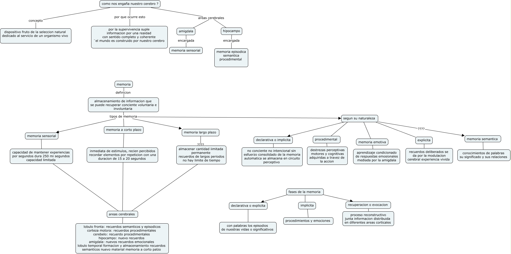 Este Cmap, tiene información relacionada con: memoria, fases de la memoria ???? implicita, explicita ???? recuerdos deliberados se da por la modulacion cerebral experiencia vivida, memoria emotiva ???? aprendizaje condicionado de respuestas emosionales mediada por la amigdala, fases de la memoria ???? declarativa o explicita, segun su naturaleza ???? memoria emotiva, almacenamiento de informacion que se puede recuperar conciente voluntaria e involuntaria tipos de memoria memoria a corto plazo, segun su naturaleza ???? procedimental, almacenamiento de informacion que se puede recuperar conciente voluntaria e involuntaria tipos de memoria memoria sensorial, como nos engaña nuestro cerebro ? areas cerebrales hipocampo, procedimental ???? destrezas perceptivas motores y cognitivas adquiridas a travez de la accion, como nos engaña nuestro cerebro ? concepto dispositivo fruto de la seleccion natural dedicado al servicio de un organismo vivo, memoria definicion almacenamiento de informacion que se puede recuperar conciente voluntaria e involuntaria, segun su naturaleza ???? explicita, almacenamiento de informacion que se puede recuperar conciente voluntaria e involuntaria tipos de memoria segun su naturaleza, segun su naturaleza ???? declarativa o implicita, declarativa o implicita ???? no conciente no intencional sin esfuerzo consolidado de la memoria automatica se almacena en circuito perceptivo, memoria a corto plazo ???? inmediata de estimulos, recien percibidos recordar elementos por repeticion con una duracion de 15 a 20 segundos, hipocampo encargada memoria episodica semantica procedimental, memoria largo plazo ???? almacenar cantidad iimitada permanente recuerdos de largos periodos no hay limite de tiempo, declarativa o explicita ???? con palabras los episodios de nuestras vidas o significativos