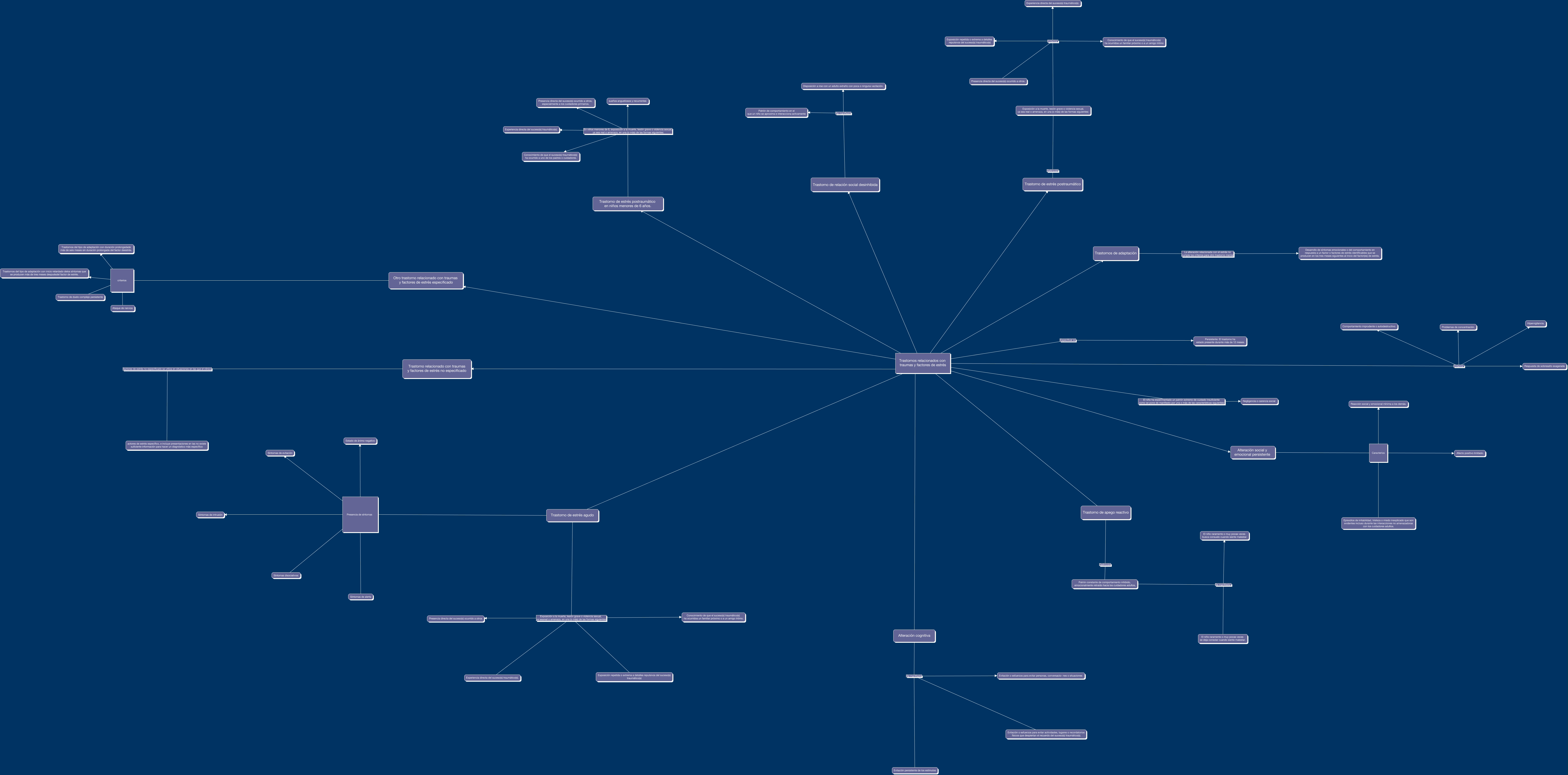 Este Cmap, tiene información relacionada con: Relacionados a Traumas, Trastorno relacionado con traumas y factores de estrés no especificado factores de estrés no especificado se utiliza en situaciones en las que el clínico actores de estrés específico, e incluye presentaciones en las no existe suficiente información para hacer un diagnóstico más específico, Trastornos relacionados con traumas y factores de estrés Alteración cognitiva, Patrón constante de comportamiento inhibido, emocionalmente retraído hacia los cuidadores adultos, Se manifiesta El niño raramente o muy pocas veces busca consuelo cuando siente malestar., Trastorno de estrés postraumático en niños menores de 6 años. En niños menores de 6, exposición a la muerte, lesión grave o violencia sexual, ya sea real o amenaza, en una (o más) de las formas siguientes: Conocimiento de que el suceso(s) traumático(s) ha ocurrido a uno de los padres o cuidadores., Trastornos relacionados con traumas y factores de estrés Criterios Hipervigilancia., Exposición a la muerte, lesión grave o violencia sexual, ya sea real o amenaza, en una (o más) de las formas siguientes: Criterios Exposición repetida o extrema a detalles repulsivos del suceso(s) traumático(s), Otro trastorno relacionado con traumas y factores de estrés especificado criterios Trastornos del tipo de adaptación con inicio retardado de los síntomas que se producen más de tres meses después del factor de estrés., Trastornos relacionados con traumas y factores de estrés Alteración social y emocional persistente, Trastorno de estrés postraumático en niños menores de 6 años. En niños menores de 6, exposición a la muerte, lesión grave o violencia sexual, ya sea real o amenaza, en una (o más) de las formas siguientes: Experiencia directa del suceso(s) traumático(s)., Trastornos relacionados con traumas y factores de estrés Criterios Comportamiento imprudente o autodestructivo., Trastornos relacionados con traumas y factores de estrés Trastorno de estrés agudo, Trastorno de relación social desinhibida Se manifiesta Disposición a irse con un adulto extraño con poca o ninguna vacilación., Trastornos relacionados con traumas y factores de estrés ???? Trastorno de estrés postraumático, Trastornos de adaptación La alteración relacionada con el estrés no cumple los criterios para otro trastorno mental Desarrollo de síntomas emocionales o del comportamiento en respuesta a un factor o factores de estrés identificables que se producen en los tres meses siguientes al inicio del factor(es) de estrés., Trastornos relacionados con traumas y factores de estrés ???? Trastornos de adaptación, Exposición a la muerte, lesión grave o violencia sexual, ya sea real o amenaza, en una (o más) de las formas siguientes: Criterios Presencia directa del suceso(s) ocurrido a otros., Trastorno de estrés postraumático en niños menores de 6 años. En niños menores de 6, exposición a la muerte, lesión grave o violencia sexual, ya sea real o amenaza, en una (o más) de las formas siguientes: sueños angustiosos y recurrentes, Trastorno de estrés agudo Presencia de síntomas Síntomas disociativos:, Exposición a la muerte, lesión grave o violencia sexual, ya sea real o amenaza, en una (o más) de las formas siguientes: Definición Trastorno de estrés postraumático, Trastorno de relación social desinhibida Se manifiesta Patrón de comportamiento en el que un niño se aproxima e interacciona activamente