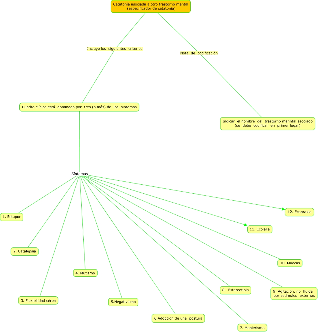 Este Cmap, tiene información relacionada con: Catatonía asociada a otro trastorno mental (especificador de catatonía), Cuadro clínico está dominado por tres (o más) de los sintomas Síntomas 6.Adopción de una postura, Cuadro clínico está dominado por tres (o más) de los sintomas Síntomas 5.Negativismo, Cuadro clínico está dominado por tres (o más) de los sintomas Síntomas 10. Muecas, Cuadro clínico está dominado por tres (o más) de los sintomas Síntomas 1. Estupor, Cuadro clínico está dominado por tres (o más) de los sintomas Síntomas 9. Agitación, no fluida por estímulos externos, Cuadro clínico está dominado por tres (o más) de los sintomas Síntomas 8. Estereotipia, Cuadro clínico está dominado por tres (o más) de los sintomas Síntomas 12. Ecopraxia, Cuadro clínico está dominado por tres (o más) de los sintomas Síntomas 4. Mutismo, Catatonía asociada a otro trastorno mental (especificador de catatonía) Nota de codificación Indicar el nombre del trastorno menntal asociado (se debe codificar en primer lugar)., Cuadro clínico está dominado por tres (o más) de los sintomas Síntomas 2. Catalepsia, Cuadro clínico está dominado por tres (o más) de los sintomas Síntomas 7. Manierismo, Catatonía asociada a otro trastorno mental (especificador de catatonía) Incluye los siguientes criterios Cuadro clínico está dominado por tres (o más) de los sintomas, Cuadro clínico está dominado por tres (o más) de los sintomas Síntomas 11. Ecolalia, Cuadro clínico está dominado por tres (o más) de los sintomas Síntomas 3. Flexibilidad cérea