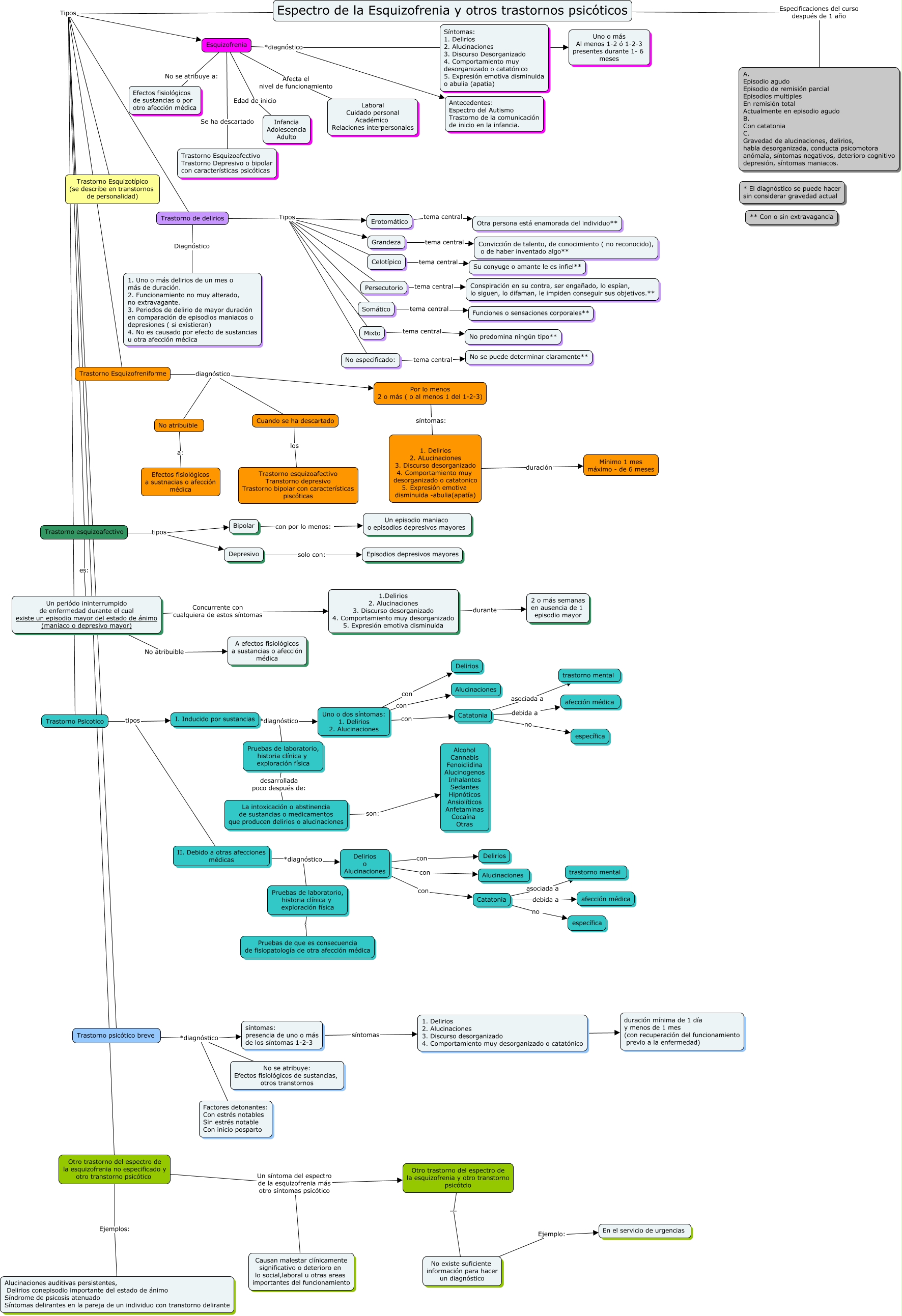 Este Cmap, tiene información relacionada con: 2. Espectro de la esquizofrenia y otros trastornos psicóticos, Un periódo ininterrumpido de enfermedad durante el cual existe un episodio mayor del estado de ánimo (maniaco o depresivo mayor) No atribuible A efectos fisiológicos a sustancias o afección médica, Catatonia debida a afección médica, Trastorno de delirios Tipos Celotípico, II. Debido a otras afecciones médicas *diagnóstico Delirios o Alucinaciones, Trastorno psicótico breve *diagnóstico síntomas: presencia de uno o más de los síntomas 1-2-3, Trastorno psicótico breve *diagnóstico No se atribuye: Efectos fisiológicos de sustancias, otros transtornos, La intoxicación o abstinencia de sustancias o medicamentos que producen delirios o alucinaciones son: Alcohol Cannabis Fenoiclidina Alucinogenos Inhalantes Sedantes Hipnóticos Ansiolíticos Anfetaminas Cocaína Otras, Espectro de la Esquizofrenia y otros trastornos psicóticos Tipos Trastorno Psicotico, Trastorno Esquizofreniforme diagnóstico No atribuible, Espectro de la Esquizofrenia y otros trastornos psicóticos Tipos Trastorno psicótico breve, Persecutorio tema central Conspiración en su contra, ser engañado, lo espían, lo siguen, lo difaman, le impiden conseguir sus objetivos.**, Grandeza tema central Convicción de talento, de conocimiento ( no reconocido), o de haber inventado algo**, Bipolar con por lo menos: Un episodio maniaco o episodios depresivos mayores, Delirios o Alucinaciones con Alucinaciones, Trastorno de delirios Tipos Persecutorio, Pruebas de laboratorio, historia clínica y exploración física . Pruebas de que es consecuencia de fisiopatología de otra afección médica, Catatonia debida a afección médica, Celotípico tema central Su conyuge o amante le es infiel**, Otro trastorno del espectro de la esquizofrenia y otro transtorno psicótcio ... No existe suficiente información para hacer un diagnóstico, Somático tema central Funciones o sensaciones corporales**