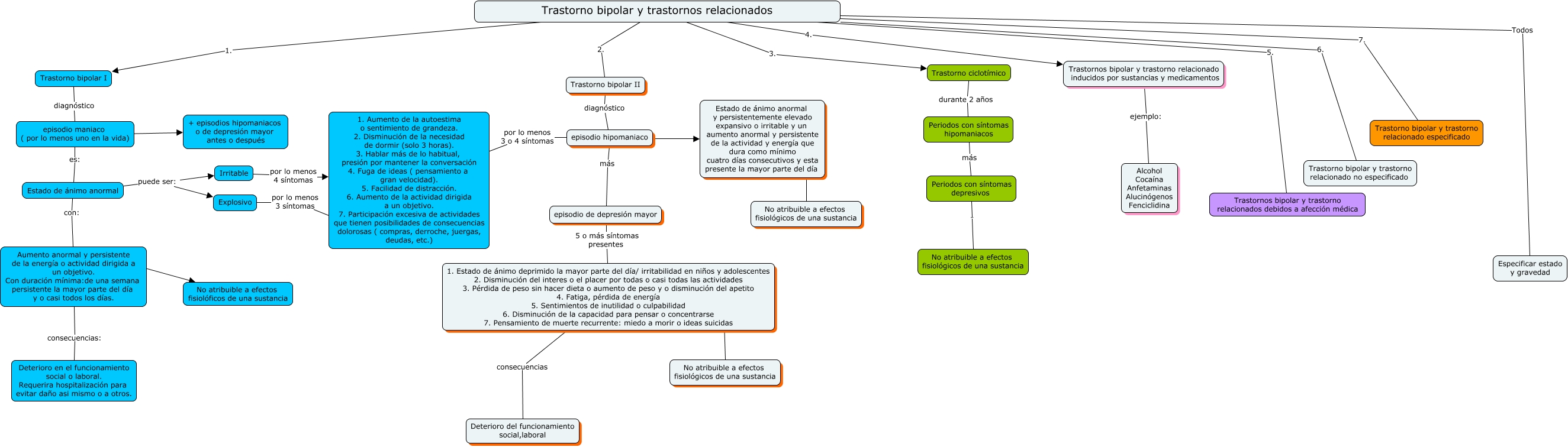 Este Cmap, tiene información relacionada con: 3.Trastorno bipolar y trastornos relacionados, Estado de ánimo anormal puede ser: Irritable, Periodos con síntomas depresivos . No atribuible a efectos fisiológicos de una sustancia, Trastorno bipolar y trastornos relacionados 7. Trastorno bipolar y trastorno relacionado especificado, Trastorno bipolar y trastornos relacionados 4. Trastornos bipolar y trastorno relacionado inducidos por sustancias y medicamentos, 1. Estado de ánimo deprimido la mayor parte del día/ irritabilidad en niños y adolescentes 2. Disminución del interes o el placer por todas o casi todas las actividades 3. Pérdida de peso sin hacer dieta o aumento de peso y o disminución del apetito 4. Fatiga, pérdida de energía 5. Sentimientos de inutilidad o culpabilidad 6. Disminución de la capacidad para pensar o concentrarse 7. Pensamiento de muerte recurrente: miedo a morir o ideas suicidas ???? No atribuible a efectos fisiológicos de una sustancia, Aumento anormal y persistente de la energía o actividad dirigida a un objetivo. Con duración mínima:de una semana persistente la mayor parte del día y o casi todos los días. consecuencias: Deterioro en el funcionamiento social o laboral. Requerira hospitalización para evitar daño asi mismo o a otros., Trastorno bipolar II diagnóstico episodio hipomaniaco, episodio de depresión mayor 5 o más síntomas presentes 1. Estado de ánimo deprimido la mayor parte del día/ irritabilidad en niños y adolescentes 2. Disminución del interes o el placer por todas o casi todas las actividades 3. Pérdida de peso sin hacer dieta o aumento de peso y o disminución del apetito 4. Fatiga, pérdida de energía 5. Sentimientos de inutilidad o culpabilidad 6. Disminución de la capacidad para pensar o concentrarse 7. Pensamiento de muerte recurrente: miedo a morir o ideas suicidas, Irritable por lo menos 4 síntomas 1. Aumento de la autoestima o sentimiento de grandeza. 2. Disminución de la necesidad de dormir (solo 3 horas). 3. Hablar más de lo habitual, presión por mantener la conversación 4. Fuga de ideas ( pensamiento a gran velocidad). 5. Facilidad de distracción. 6. Aumento de la actividad dirigida a un objetivo. 7. Participación excesiva de actividades que tienen posibilidades de consecuencias dolorosas ( compras, derroche, juergas, deudas, etc.), episodio maniaco ( por lo menos uno en la vida) ???? + episodios hipomaniacos o de depresión mayor antes o después, Explosivo por lo menos 3 síntomas 1. Aumento de la autoestima o sentimiento de grandeza. 2. Disminución de la necesidad de dormir (solo 3 horas). 3. Hablar más de lo habitual, presión por mantener la conversación 4. Fuga de ideas ( pensamiento a gran velocidad). 5. Facilidad de distracción. 6. Aumento de la actividad dirigida a un objetivo. 7. Participación excesiva de actividades que tienen posibilidades de consecuencias dolorosas ( compras, derroche, juergas, deudas, etc.), Trastorno bipolar y trastornos relacionados 6. Trastorno bipolar y trastorno relacionado no especificado, episodio maniaco ( por lo menos uno en la vida) es: Estado de ánimo anormal, episodio hipomaniaco por lo menos 3 o 4 síntomas 1. Aumento de la autoestima o sentimiento de grandeza. 2. Disminución de la necesidad de dormir (solo 3 horas). 3. Hablar más de lo habitual, presión por mantener la conversación 4. Fuga de ideas ( pensamiento a gran velocidad). 5. Facilidad de distracción. 6. Aumento de la actividad dirigida a un objetivo. 7. Participación excesiva de actividades que tienen posibilidades de consecuencias dolorosas ( compras, derroche, juergas, deudas, etc.), episodio hipomaniaco más episodio de depresión mayor, Periodos con síntomas hipomaniacos más Periodos con síntomas depresivos, Trastorno bipolar y trastornos relacionados 3. Trastorno ciclotímico, Trastorno bipolar y trastornos relacionados 2. Trastorno bipolar II, Trastorno bipolar I diagnóstico episodio maniaco ( por lo menos uno en la vida), Aumento anormal y persistente de la energía o actividad dirigida a un objetivo. Con duración mínima:de una semana persistente la mayor parte del día y o casi todos los días. ???? No atribuible a efectos fisiolóficos de una sustancia