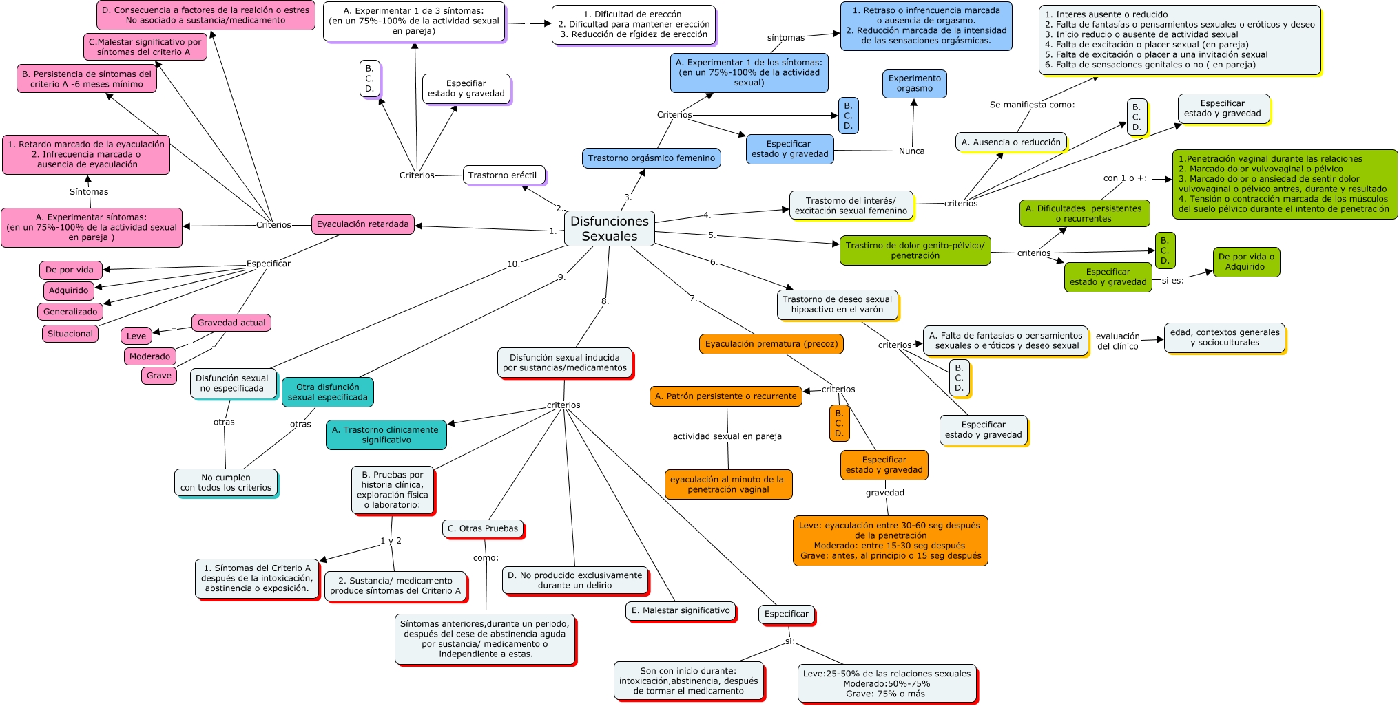 Este Cmap, tiene información relacionada con: 13. Disfunciones Sexuales, A. Experimentar síntomas: (en un 75%-100% de la actividad sexual en pareja ) Síntomas 1. Retardo marcado de la eyaculación 2. Infrecuencia marcada o ausencia de eyaculación, Disfunción sexual inducida por sustancias/medicamentos criterios Especificar, Eyaculación retardada Especificar Adquirido, Trastirno de dolor genito-pélvico/ penetración criterios A. Dificultades persistentes o recurrentes, Trastorno del interés/ excitación sexual femenino criterios Especificar estado y gravedad, Trastorno de deseo sexual hipoactivo en el varón criterios A. Falta de fantasías o pensamientos sexuales o eróticos y deseo sexual, Especificar si: Son con inicio durante: intoxicación,abstinencia, después de tormar el medicamento, Gravedad actual - Grave, Disfunciones Sexuales 7. Eyaculación prematura (precoz), Especificar estado y gravedad si es: De por vida o Adquirido, Disfunciones Sexuales 3. Trastorno orgásmico femenino, A. Falta de fantasías o pensamientos sexuales o eróticos y deseo sexual evaluación del clínico edad, contextos generales y socioculturales, Especificar si: Leve:25-50% de las relaciones sexuales Moderado:50%-75% Grave: 75% o más, Disfunción sexual inducida por sustancias/medicamentos criterios A. Trastorno clínicamente significativo, Disfunción sexual no especificada otras No cumplen con todos los criterios, Eyaculación prematura (precoz) criterios A. Patrón persistente o recurrente, C. Otras Pruebas como: Síntomas anteriores,durante un periodo, después del cese de abstinencia aguda por sustancia/ medicamento o independiente a estas., B. Pruebas por historia clínica, exploración física o laboratorio: 1 y 2 1. Síntomas del Criterio A después de la intoxicación, abstinencia o exposición., Eyaculación retardada Criterios C.Malestar significativo por síntomas del criterio A, Disfunciones Sexuales 4. Trastorno del interés/ excitación sexual femenino