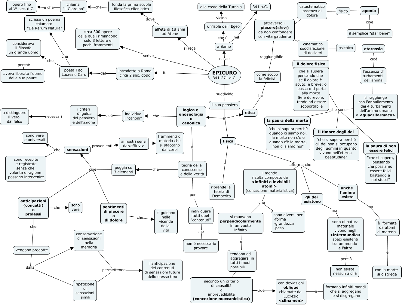 Questa Cmap, creata con IHMC CmapTools, contiene informazioni relative a: Epicuro, EPICURO 341-271 a.C. scrive circa 300 opere delle quali rimangono solo 3 lettere e pochi frammenti, si raggiunge con l'annullamento dei 4 turbamenti dell'animo umano o <quadrifarmaco> che sono il dolore fisico, poeta Tito Lucrezio Caro che scrisse un poema chiamato "De Rerum Natura", il mondo risulta composto da <infiniti e invisibili atomi> (concezione materialistica) che si muovono perpendicolarmente in un vuoto infinito, fisica afferma che anche l'anima esiste, catastematico assenza di dolore ???? fisico, l'assenza di turbamenti dell'anima che si raggiunge con l'annullamento dei 4 turbamenti dell'animo umano o <quadrifarmaco>, teoria della conoscenza e della verità che poggia su 3 elementi, etica ha come scopo la felicità, chiama "il Giardino" e che operò fino al V° sec. d.C., un'isola dell' Egeo vicino alle coste della Turchia, aponìa cioè il semplice "star bene", sensazioni che sono recepite e registrate senza che volontà o ragione possano intervenire, poggia su 3 elementi cioè sentimenti di piacere o di dolore, anticipazioni (concetti) o prolessi che sono vere, a Samo che è un'isola dell' Egeo, anche l'anima esiste ma è formata da atomi di materia, fisica afferma che il mondo risulta composto da <infiniti e invisibili atomi> (concezione materialistica), vengono prodotte dalla ripetizione di sensazioni simili, si raggiunge con l'annullamento dei 4 turbamenti dell'animo umano o <quadrifarmaco> che sono la paura della morte
