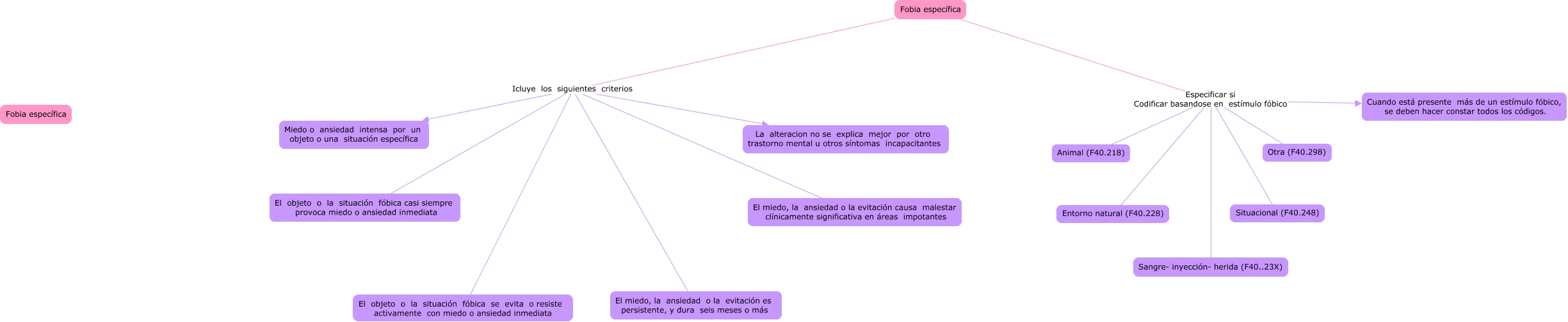 Este Cmap, tiene información relacionada con: Fobia específica, Fobia específica Icluye los siguientes criterios Miedo o ansiedad intensa por un objeto o una situación específica, Fobia específica Especificar si Codificar basandose en estímulo fóbico Otra (F40.298), Fobia específica Especificar si Codificar basandose en estímulo fóbico Situacional (F40.248), Fobia específica Icluye los siguientes criterios La alteracion no se explica mejor por otro trastorno mental u otros síntomas incapacitantes, Fobia específica Especificar si Codificar basandose en estímulo fóbico Entorno natural (F40.228), Fobia específica Icluye los siguientes criterios El miedo, la ansiedad o la evitación es persistente, y dura seis meses o más, Fobia específica Icluye los siguientes criterios El objeto o la situación fóbica casi siempre provoca miedo o ansiedad inmediata, Fobia específica Especificar si Codificar basandose en estímulo fóbico Sangre- inyección- herida (F40..23X), Fobia específica Icluye los siguientes criterios El objeto o la situación fóbica se evita o resiste activamente con miedo o ansiedad inmediata, Fobia específica Icluye los siguientes criterios El miedo, la ansiedad o la evitación causa malestar clínicamente significativa en áreas impotantes, Fobia específica Especificar si Codificar basandose en estímulo fóbico Animal (F40.218), Fobia específica Especificar si Codificar basandose en estímulo fóbico Cuando está presente más de un estímulo fóbico, se deben hacer constar todos los códigos.