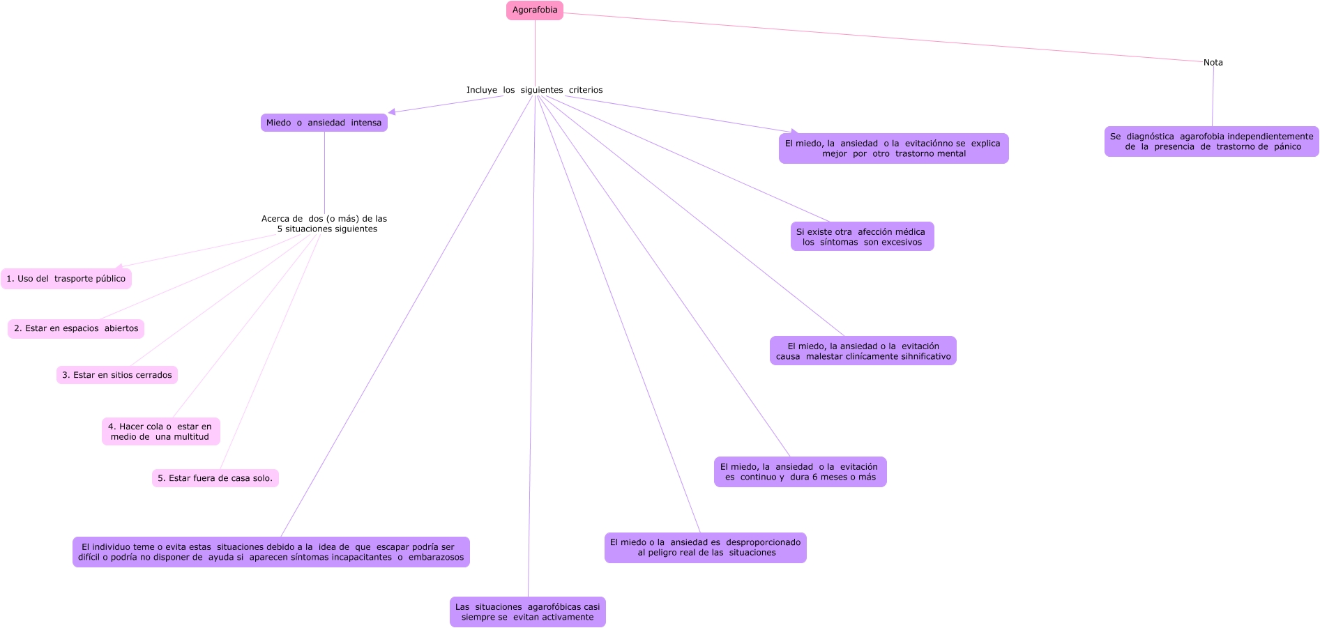Este Cmap, tiene información relacionada con: Agorafobia, Agorafobia Incluye los siguientes criterios El individuo teme o evita estas situaciones debido a la idea de que escapar podría ser difícil o podría no disponer de ayuda si aparecen síntomas incapacitantes o embarazosos, Agorafobia Incluye los siguientes criterios El miedo o la ansiedad es desproporcionado al peligro real de las situaciones, Agorafobia Incluye los siguientes criterios Las situaciones agarofóbicas casi siempre se evitan activamente, Miedo o ansiedad intensa Acerca de dos (o más) de las 5 situaciones siguientes 1. Uso del trasporte público, Miedo o ansiedad intensa Acerca de dos (o más) de las 5 situaciones siguientes 3. Estar en sitios cerrados, Agorafobia Nota Se diagnóstica agarofobia independientemente de la presencia de trastorno de pánico, Agorafobia Incluye los siguientes criterios Si existe otra afección médica los síntomas son excesivos, Agorafobia Incluye los siguientes criterios El miedo, la ansiedad o la evitación causa malestar clinícamente sihnificativo, Agorafobia Incluye los siguientes criterios El miedo, la ansiedad o la evitación es continuo y dura 6 meses o más, Miedo o ansiedad intensa Acerca de dos (o más) de las 5 situaciones siguientes 5. Estar fuera de casa solo., Agorafobia Incluye los siguientes criterios El miedo, la ansiedad o la evitaciónno se explica mejor por otro trastorno mental, Agorafobia Incluye los siguientes criterios Miedo o ansiedad intensa, Miedo o ansiedad intensa Acerca de dos (o más) de las 5 situaciones siguientes 2. Estar en espacios abiertos, Miedo o ansiedad intensa Acerca de dos (o más) de las 5 situaciones siguientes 4. Hacer cola o estar en medio de una multitud