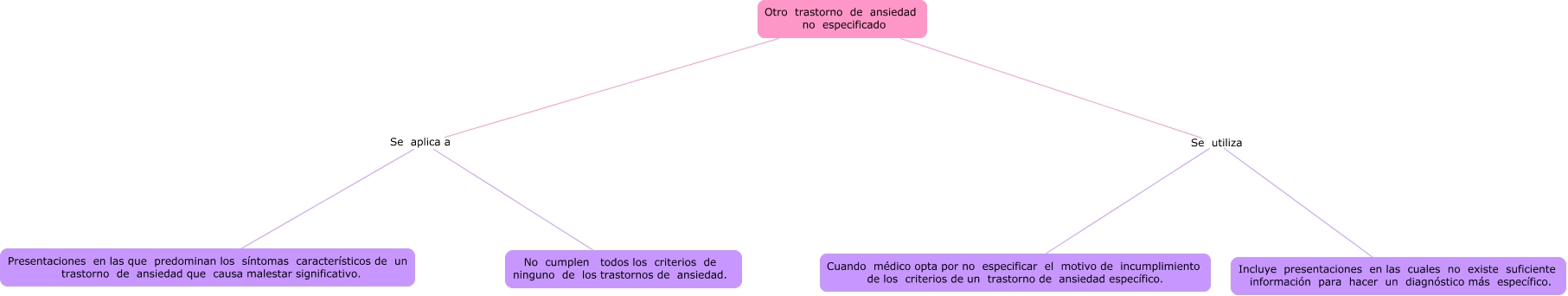 Este Cmap, tiene información relacionada con: Otro trastorno de ansiedad no especificado, Otro trastorno de ansiedad no especificado Se aplica a No cumplen todos los criterios de ninguno de los trastornos de ansiedad., Otro trastorno de ansiedad no especificado Se utiliza Incluye presentaciones en las cuales no existe suficiente información para hacer un diagnóstico más específico., Otro trastorno de ansiedad no especificado Se aplica a Presentaciones en las que predominan los síntomas característicos de un trastorno de ansiedad que causa malestar significativo., Otro trastorno de ansiedad no especificado Se utiliza Cuando médico opta por no especificar el motivo de incumplimiento de los criterios de un trastorno de ansiedad específico.