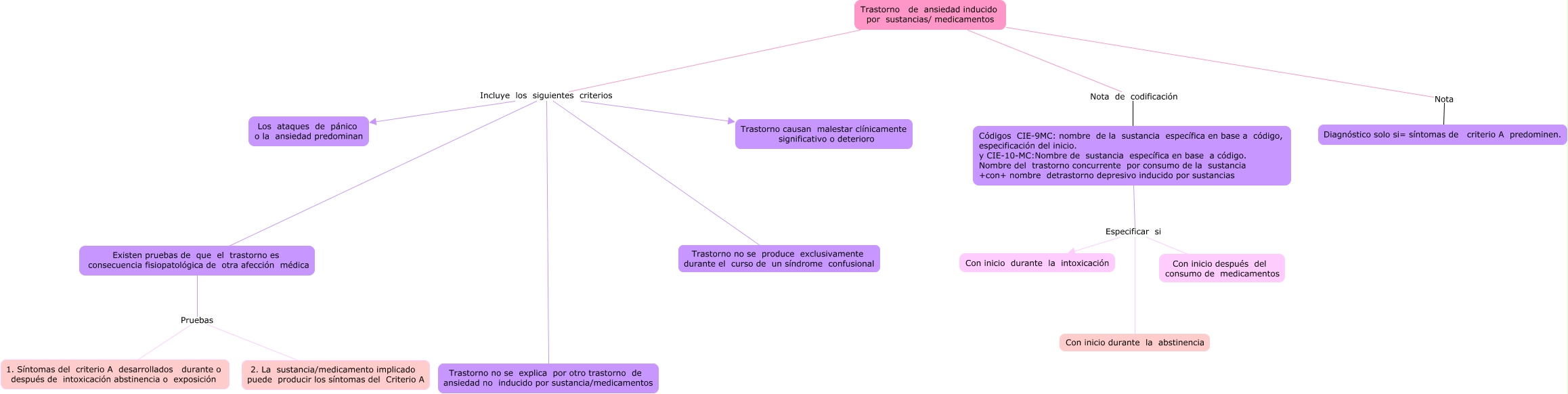 Este Cmap, tiene información relacionada con: Trastorno de ansiedad inducido por sustancias mediamentos, Códigos CIE-9MC: nombre de la sustancia específica en base a código, especificación del inicio. y CIE-10-MC:Nombre de sustancia específica en base a código. Nombre del trastorno concurrente por consumo de la sustancia +con+ nombre detrastorno depresivo inducido por sustancias Especificar si Con inicio después del consumo de medicamentos, Existen pruebas de que el trastorno es consecuencia fisiopatológica de otra afección médica Pruebas 1. Síntomas del criterio A desarrollados durante o después de intoxicación abstinencia o exposición, Existen pruebas de que el trastorno es consecuencia fisiopatológica de otra afección médica Pruebas 2. La sustancia/medicamento implicado puede producir los síntomas del Criterio A, Trastorno de ansiedad inducido por sustancias/ medicamentos Incluye los siguientes criterios Trastorno causan malestar clínicamente significativo o deterioro, Trastorno de ansiedad inducido por sustancias/ medicamentos Nota de codificación Códigos CIE-9MC: nombre de la sustancia específica en base a código, especificación del inicio. y CIE-10-MC:Nombre de sustancia específica en base a código. Nombre del trastorno concurrente por consumo de la sustancia +con+ nombre detrastorno depresivo inducido por sustancias, Trastorno de ansiedad inducido por sustancias/ medicamentos Incluye los siguientes criterios Trastorno no se explica por otro trastorno de ansiedad no inducido por sustancia/medicamentos, Códigos CIE-9MC: nombre de la sustancia específica en base a código, especificación del inicio. y CIE-10-MC:Nombre de sustancia específica en base a código. Nombre del trastorno concurrente por consumo de la sustancia +con+ nombre detrastorno depresivo inducido por sustancias Especificar si Con inicio durante la intoxicación, Trastorno de ansiedad inducido por sustancias/ medicamentos Incluye los siguientes criterios Los ataques de pánico o la ansiedad predominan, Trastorno de ansiedad inducido por sustancias/ medicamentos Incluye los siguientes criterios Existen pruebas de que el trastorno es consecuencia fisiopatológica de otra afección médica, Trastorno de ansiedad inducido por sustancias/ medicamentos Nota Diagnóstico solo si= síntomas de criterio A predominen., Códigos CIE-9MC: nombre de la sustancia específica en base a código, especificación del inicio. y CIE-10-MC:Nombre de sustancia específica en base a código. Nombre del trastorno concurrente por consumo de la sustancia +con+ nombre detrastorno depresivo inducido por sustancias Especificar si Con inicio durante la abstinencia, Trastorno de ansiedad inducido por sustancias/ medicamentos Incluye los siguientes criterios Trastorno no se produce exclusivamente durante el curso de un síndrome confusional