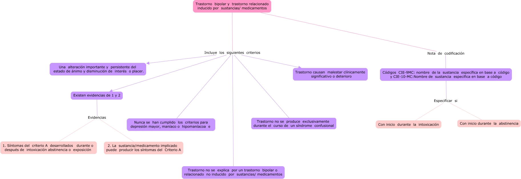 Este Cmap, tiene información relacionada con: Trastorno bipolar y trastorno relacionado inducido por sustancias medicamentos, Trastorno bipolar y trastorno relacionado inducido por sustancias/ medicamentos Incluye los siguientes criterios Trastorno no se produce exclusivamente durante el curso de un síndrome confusional, Trastorno bipolar y trastorno relacionado inducido por sustancias/ medicamentos Incluye los siguientes criterios Existen evidencias de 1 y 2, Trastorno bipolar y trastorno relacionado inducido por sustancias/ medicamentos Incluye los siguientes criterios Trastorno no se explica por un trastorno bipolar o relacionado no inducido por sustancias/ medicamentos, Trastorno bipolar y trastorno relacionado inducido por sustancias/ medicamentos Incluye los siguientes criterios Trastorno causan malestar clínicamente significativo o deterioro, Existen evidencias de 1 y 2 Evidencias 1. Síntomas del criterio A desarrollados durante o después de intoxicación abstinencia o exposición, Códigos CIE-9MC: nombre de la sustancia específica en base a código y CIE-10-MC:Nombre de sustancia específica en base a código Especificar si Con inicio durante la abstinencia, Existen evidencias de 1 y 2 Evidencias 2. La sustancia/medicamento implicado puede producir los síntomas del Criterio A, Trastorno bipolar y trastorno relacionado inducido por sustancias/ medicamentos Incluye los siguientes criterios Una alteración importante y persistente del estado de ánimo y disminución de interés o placer., Códigos CIE-9MC: nombre de la sustancia específica en base a código y CIE-10-MC:Nombre de sustancia específica en base a código Especificar si Con inicio durante la intoxicación, Trastorno bipolar y trastorno relacionado inducido por sustancias/ medicamentos Nota de codificación Códigos CIE-9MC: nombre de la sustancia específica en base a código y CIE-10-MC:Nombre de sustancia específica en base a código, Trastorno bipolar y trastorno relacionado inducido por sustancias/ medicamentos Incluye los siguientes criterios Nunca se han cumplido los criterios para depresión mayor, maníaco o hipomaníacoa e