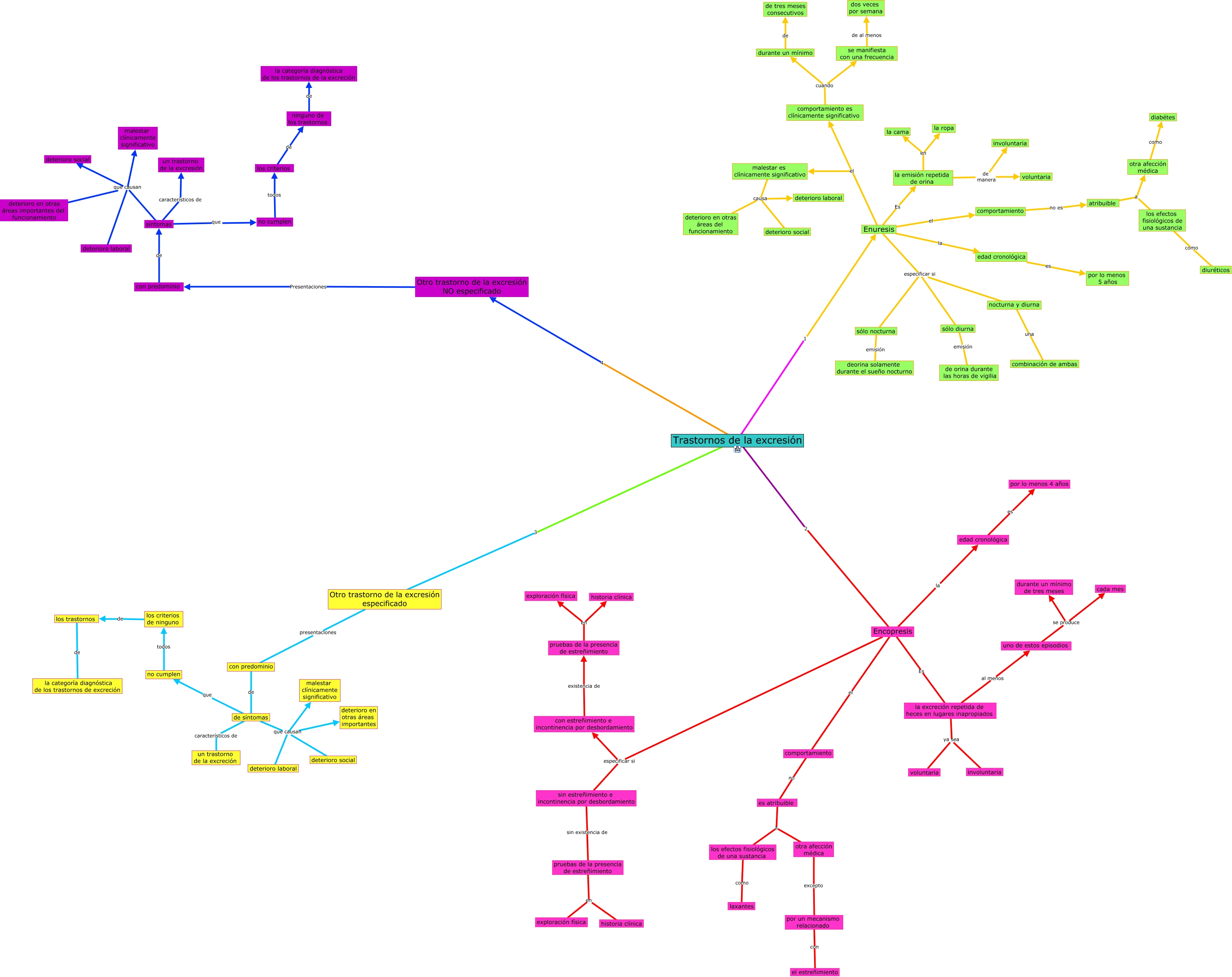 Este Cmap, tiene información relacionada con: Trastornos de la excresión, no cumplen todos los criterios, comportamiento no es atribuible, Otro trastorno de la excresión NO especificado Presentaciones con predominio, pruebas de la presencia de estreñimiento en historia clínica, de síntomas que causan deterioro social, síntomas que causan malestar clínicamente significativo, no cumplen todos los criterios de ninguno, pruebas de la presencia de estreñimiento en exploración física, síntomas que causan deterioro laboral, Enuresis especificar si nocturna y diurna, Otro trastorno de la excresión especificado presentaciones con predominio, la emisión repetida de orina de manera involuntaria, nocturna y diurna una combinación de ambas, comportamiento es clínicamente significativo cuando se manifiesta con una frecuencia, malestar es clínicamente significativo causa deterioro en otras áreas del funcionamiento, pruebas de la presencia de estreñimiento en historia clínica, se manifiesta con una frecuencia de al menos dos veces por semana, síntomas que causan deterioro en otras áreas importantes del funcionamiento, de síntomas que causan deterioro en otras áreas importantes, durante un mínimo de de tres meses consecutivos
