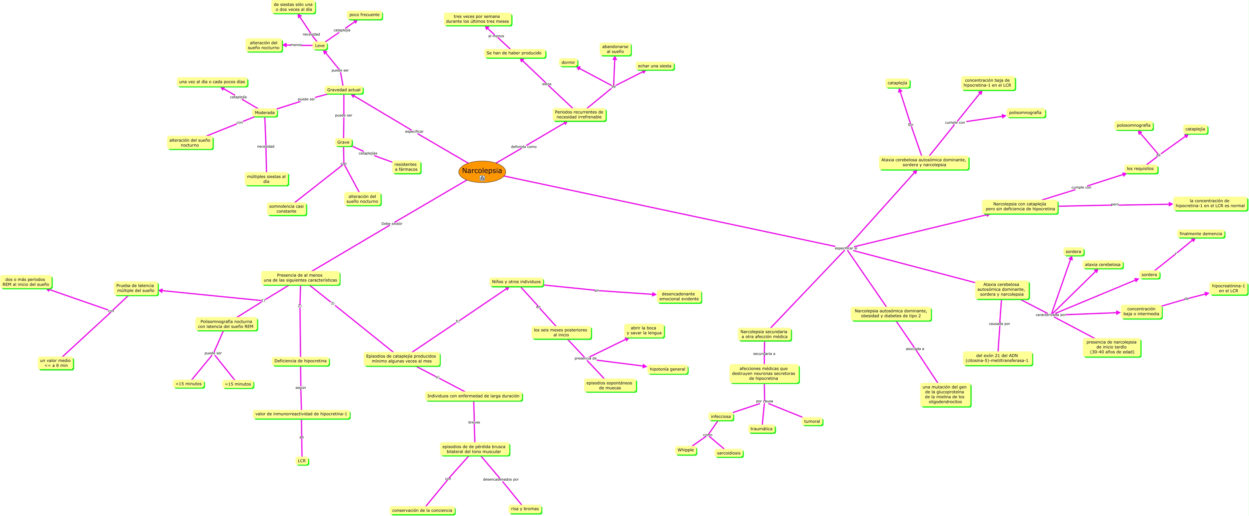Este Cmap, tiene información relacionada con: narcolepsia sss, Periodos recurrentes de necesidad irrefrenable de dormir, Ataxia cerebelosa autosómica dominante, sordera y narcolepsia caracterizada por sordera, Grave con alteración del sueño nocturno, Periodos recurrentes de necesidad irrefrenable de echar una siesta, Periodos recurrentes de necesidad irrefrenable estos Se han de haber producido, valor de inmunorreactividad de hipocretina-1 en LCR, Leve necesidad de siestas sólo una o dos veces al día, Prueba de latencia múltiple del sueño con un valor medio <= a 8 min, Moderada cataplejía una vez al día o cada pocos días, Narcolepsia especificar si Narcolepsia autosómica dominante, obesidad y diabetes de tipo 2, Narcolepsia especificar si Ataxia cerebelosa autosómica dominante, sordera y narcolepsia, Narcolepsia especificar Gravedad actual, Grave con somnolencia casi constante, Ataxia cerebelosa autosómica dominante, sordera y narcolepsia cumple con concentración baja de hipocretina-1 en el LCR, sordera y finalmente demencia, Gravedad actual puede ser Leve, Narcolepsia con cataplejía pero sin deficiencia de hipocretina pero la concentración de hipocretina-1 en el LCR es normal, Presencia de al menos una de las siguientes características 2) Deficiencia de hipocretina, los seis meses posteriores al inicio presencia de abrir la boca y savar la lengua, Niños y otros individuos en los seis meses posteriores al inicio