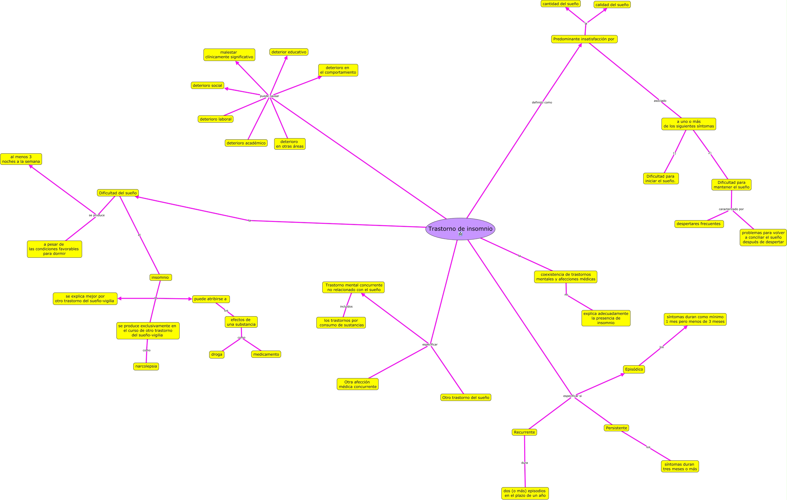 Este Cmap, tiene información relacionada con: Insomnio sss, Trastorno de insomnio especificar Otra afección médica concurrente, Trastorno de insomnio especificar si Episódico, a uno o más de los siguientes síntomas 2) Dificultad para mantener el sueño, Dificultad del sueño el insomnio, se produce exclusivamente en el curso de otro trastorno del sueño-vigilia como narcolepsia, Trastorno de insomnio especificar si Recurrente, efectos de una substancia como droga, coexistencia de trastornos mentales y afecciones médicas no explica adecuadamente la presencia de insomnio, Dificultad del sueño se produce al menos 3 noches a la semana, Dificultad para mantener el sueño caracterizado por problemas para volver a conciliar el sueño después de despertar, Trastorno de insomnio puede causar deterioro en el comportamiento, Trastorno de insomnio puede causar deterioro laboral, Predominante insatisfacción por asociado a uno o más de los siguientes síntomas, Recurrente dura dos (o más) episodios en el plazo de un año, Predominante insatisfacción por la calidad del sueño, Trastorno de insomnio puede causar deterioro en otras áreas, insomnio no puede atribirse a, Dificultad del sueño se produce a pesar de las condiciones favorables para dormir, Trastorno de insomnio puede causar malestar clínicamente significativo, Trastorno de insomnio especificar si Persistente