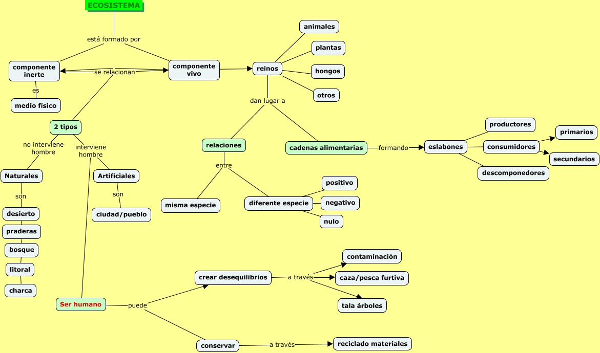 Este Cmap, tiene información relacionada con: ecosistema, reinos dan lugar a relaciones, reinos ???? plantas, Artificiales son ciudad/pueblo, relaciones entre misma especie, Ser humano puede conservar, relaciones entre diferente especie, eslabones ???? consumidores, reinos dan lugar a cadenas alimentarias, componente vivo ???? reinos, eslabones ???? descomponedores, cadenas alimentarias formando eslabones, consumidores ???? secundarios, crear desequilibrios a través contaminación, ECOSISTEMA está formado por componente vivo, componente inerte es medio físico, reinos ???? animales, praderas ???? bosque, componente vivo componente inerte, desierto ???? praderas, reinos ???? otros