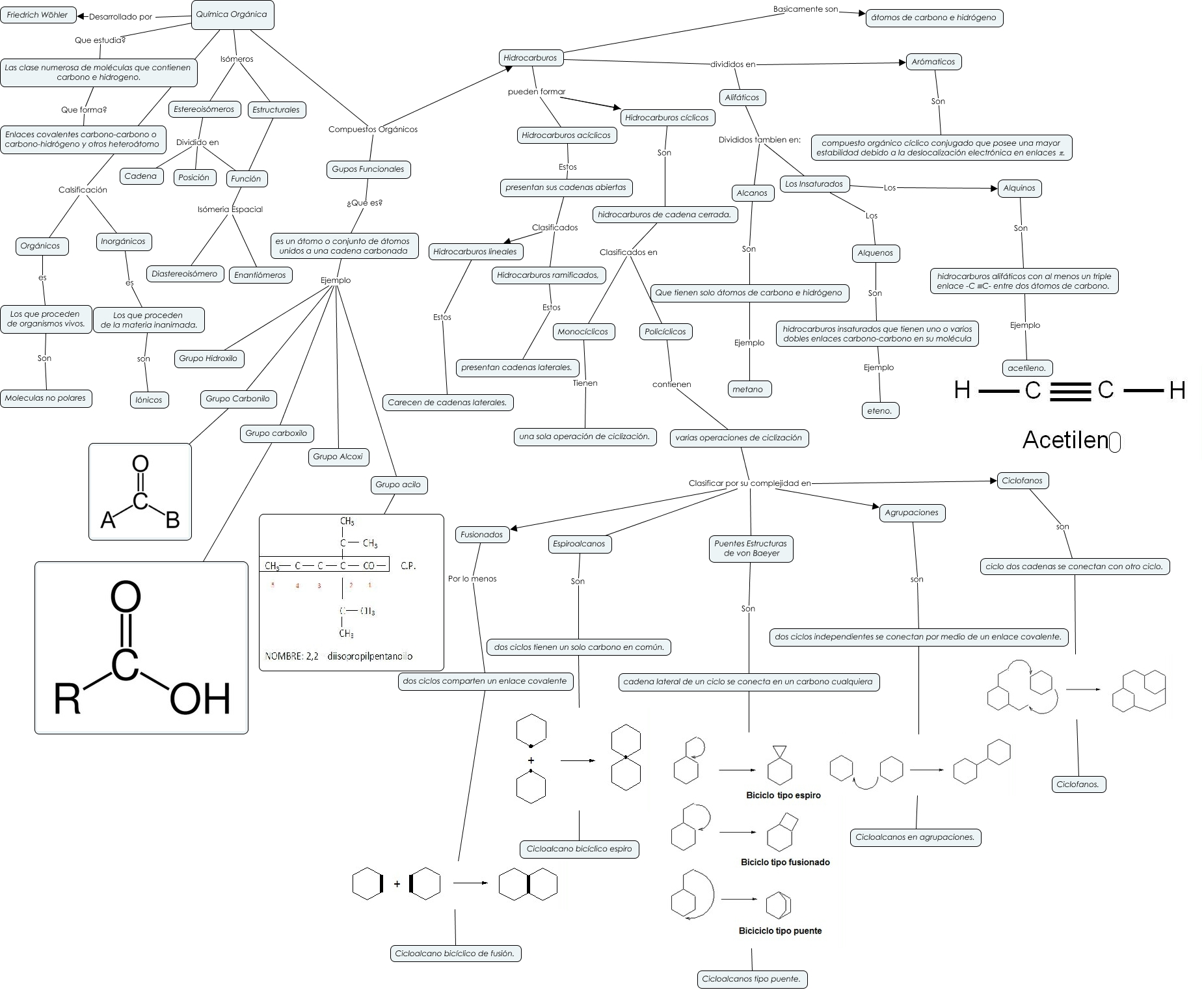 Este Cmap, tiene información relacionada con: Quimica orgánica, varias operaciones de ciclización Clasificar por su complejidad en Ciclofanos, varias operaciones de ciclización Clasificar por su complejidad en Espiroalcanos, Hidrocarburos cíclicos Son hidrocarburos de cadena cerrada., Química Orgánica Compuestos Orgánicos Hidrocarburos, Los Insaturados Los Alquinos, Estructurales Isómeria Espacial Diastereoisómero, Hidrocarburos acíclicos Estos presentan sus cadenas abiertas, Puentes Estructuras de von Baeyer Son cadena lateral de un ciclo se conecta en un carbono cualquiera, Inorgánicos es Los que proceden de la materia inanimada., Ciclofanos son ciclo dos cadenas se conectan con otro ciclo., Alcanos Son Que tienen solo átomos de carbono e hidrógeno, hidrocarburos alifáticos con al menos un triple enlace -C≡C- entre dos átomos de carbono. Ejemplo acetileno., Hidrocarburos cíclicos pueden formar Hidrocarburos acíclicos, hidrocarburos de cadena cerrada. Clasificados en Monocíclicos, dos ciclos tienen un solo carbono en común. Cicloalcano bicíclico espiro, Que tienen solo átomos de carbono e hidrógeno Ejemplo metano, Orgánicos es Los que proceden de organismos vivos., Hidrocarburos ramificados, Estos presentan cadenas laterales., Arómaticos Son compuesto orgánico cíclico conjugado que posee una mayor estabilidad debido a la deslocalización electrónica en enlaces π., Química Orgánica Calsificación Inorgánicos